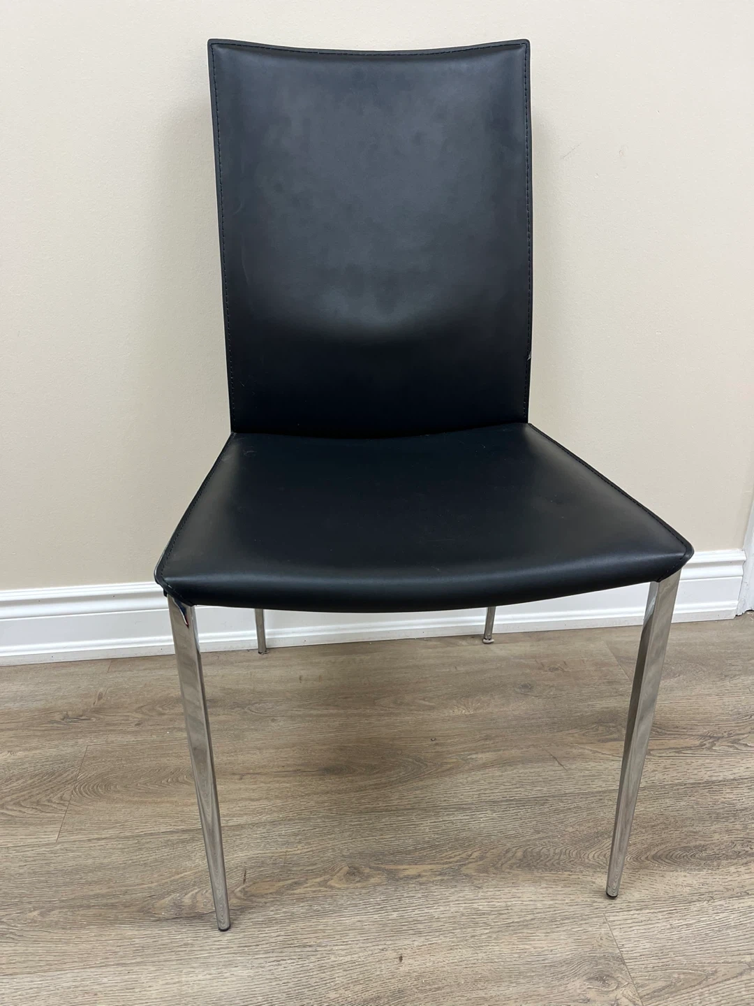 56Selling a stylish black leather chair with chrome legs. It's in great shape and would look fantastic in any modern dining room, kitchen or office! The sleek design and comfortable seat make it perfect for everyday use or special occasions