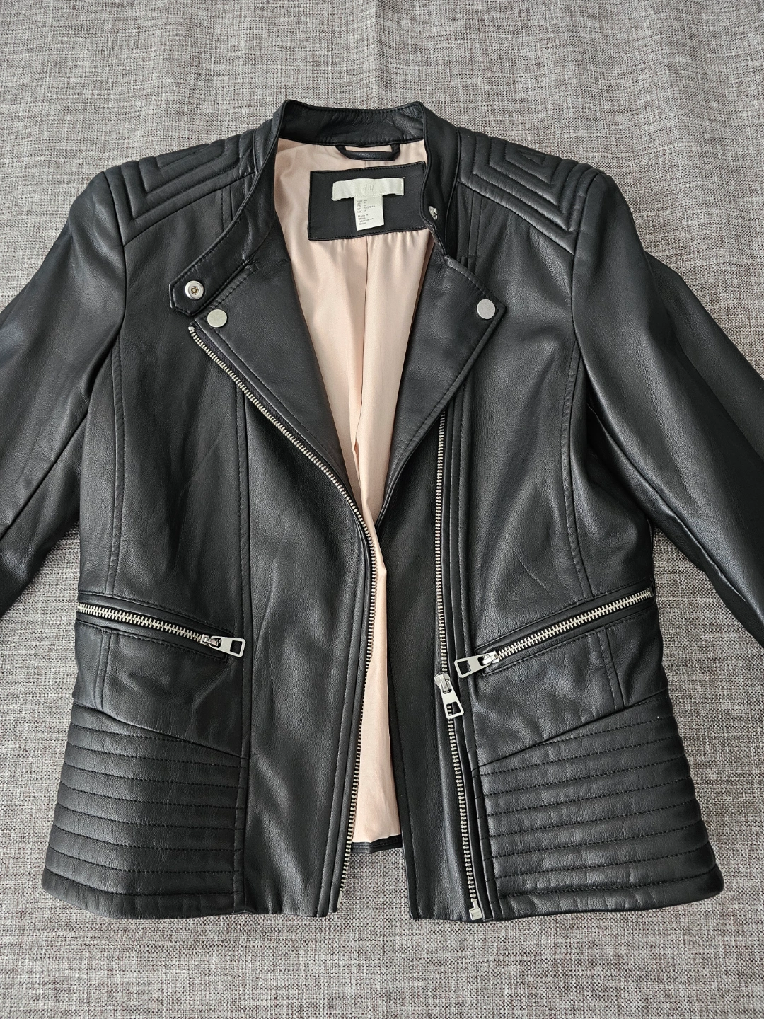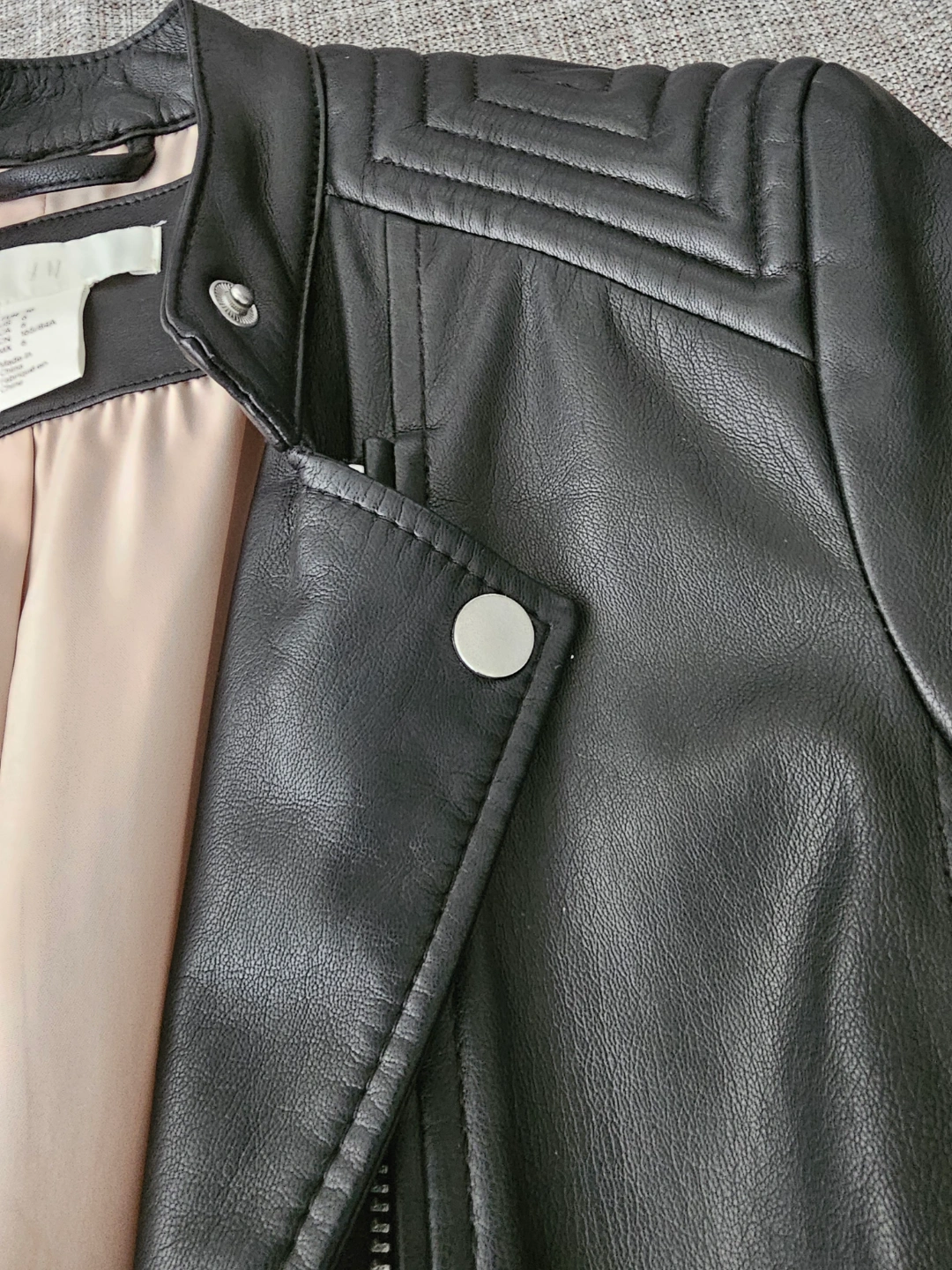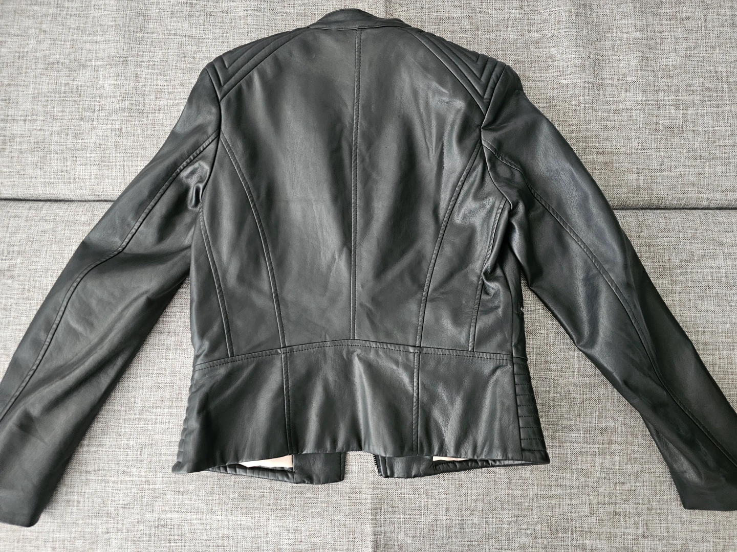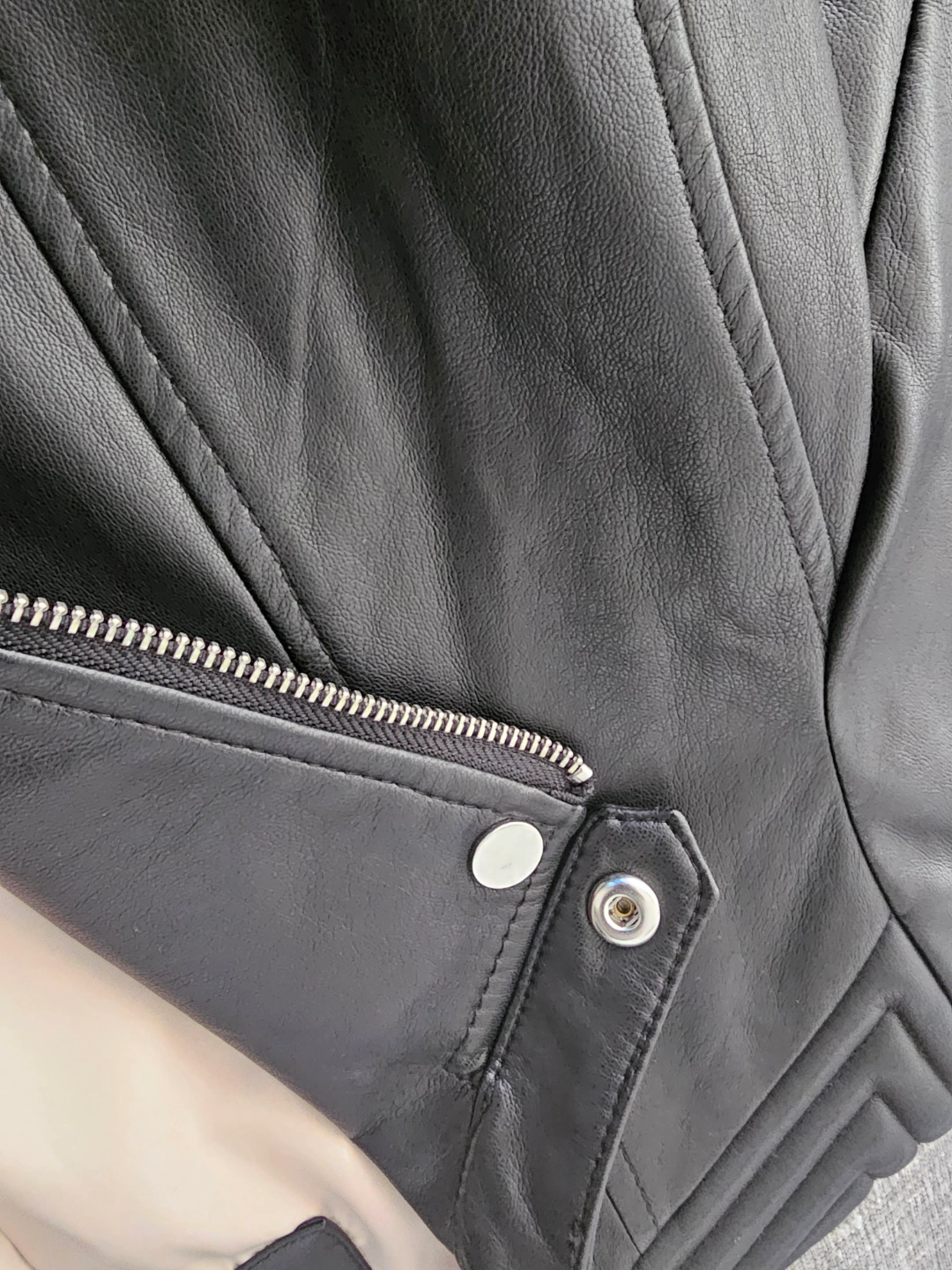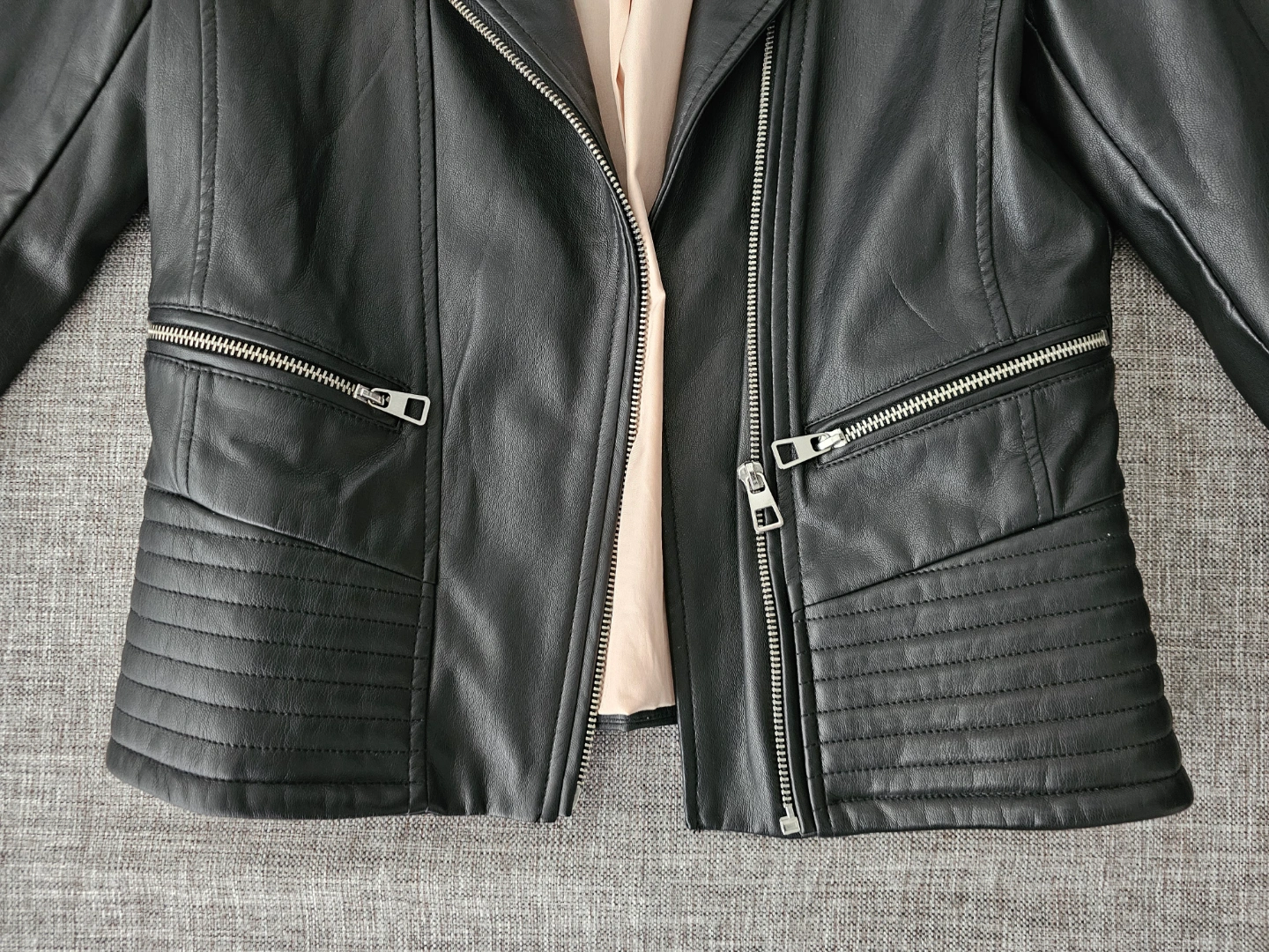 5Women's black faux leather moto jacket. Asymmetrical zipper closure. Multiple zippered pockets. Shoulder detailing. Slim fit.