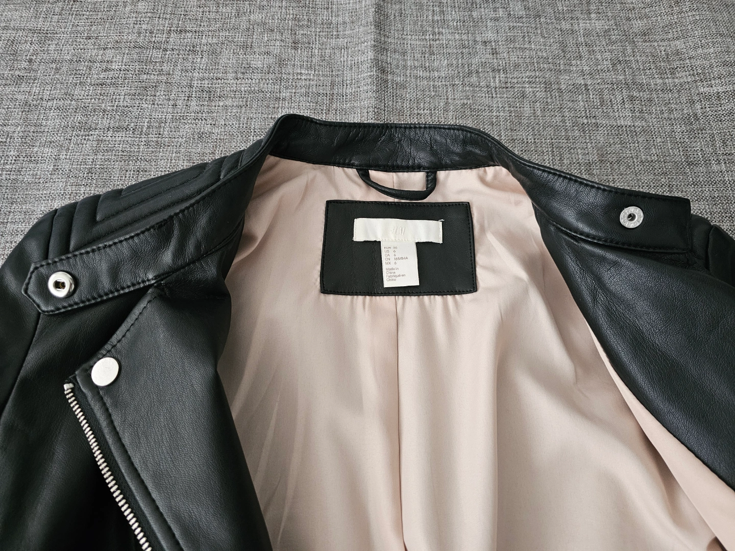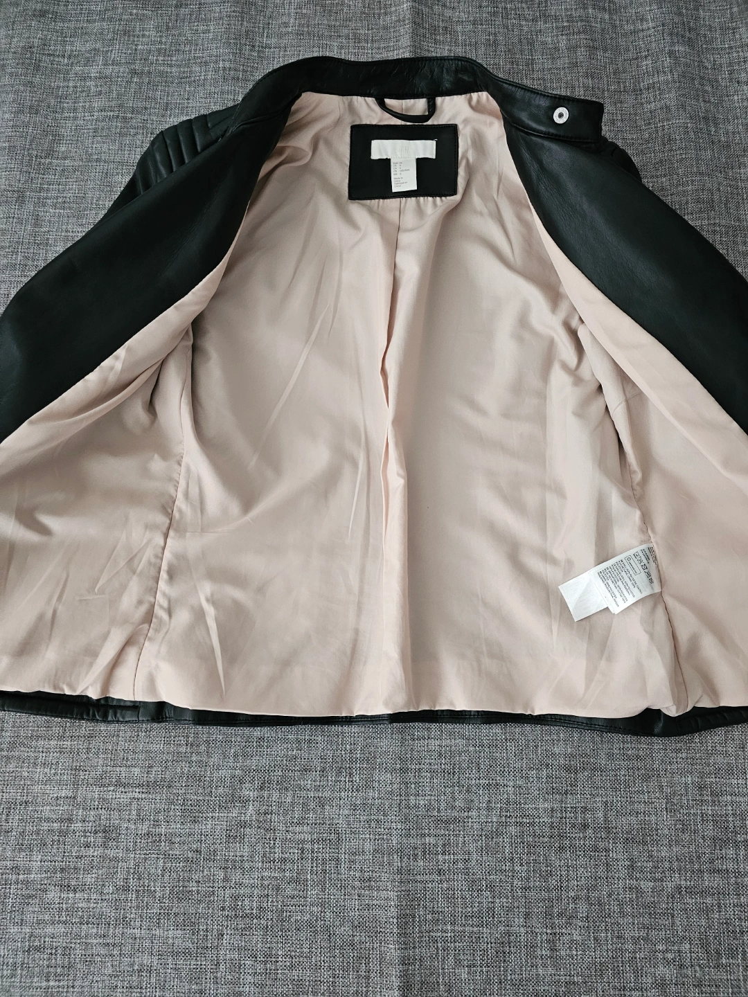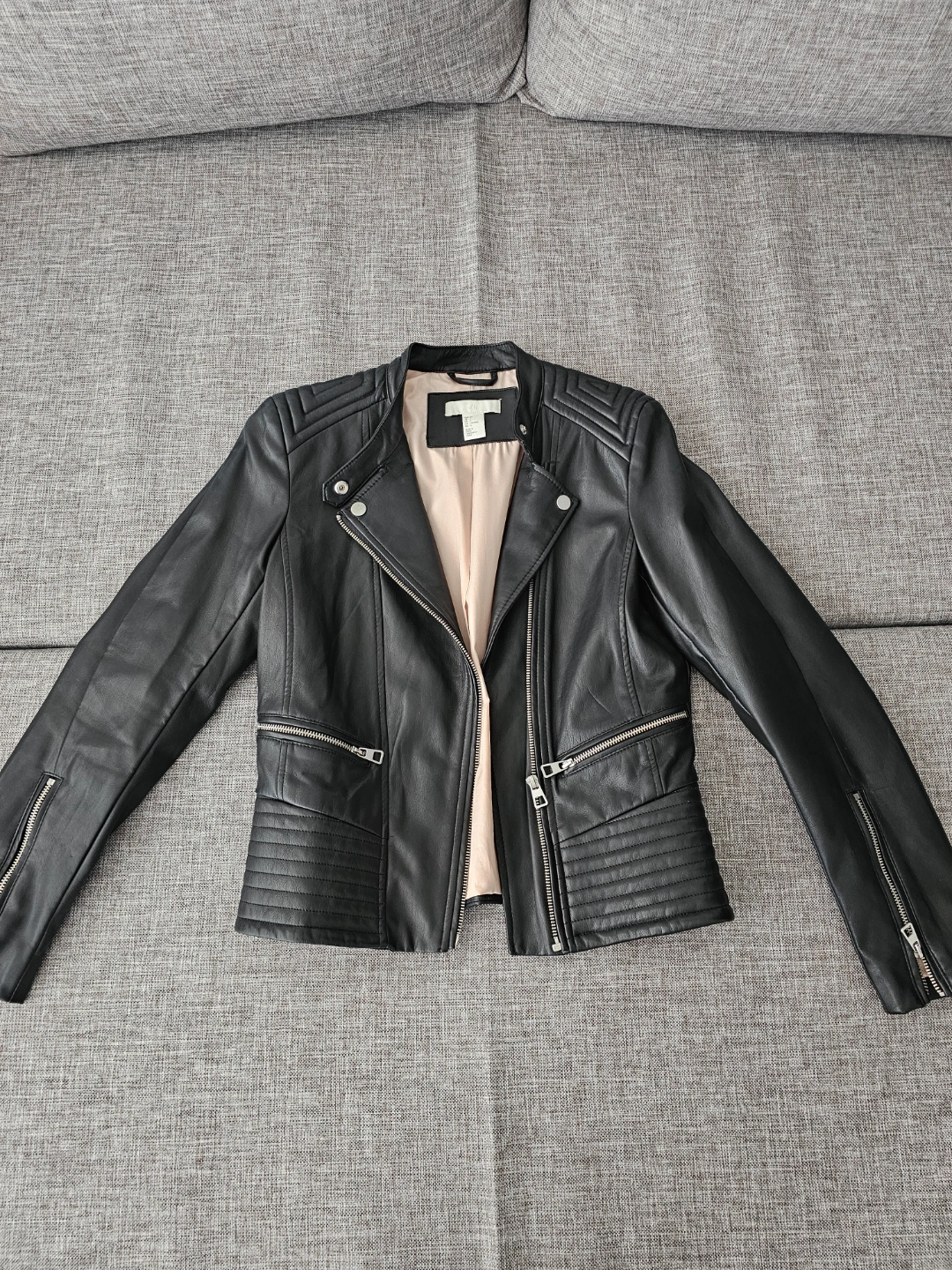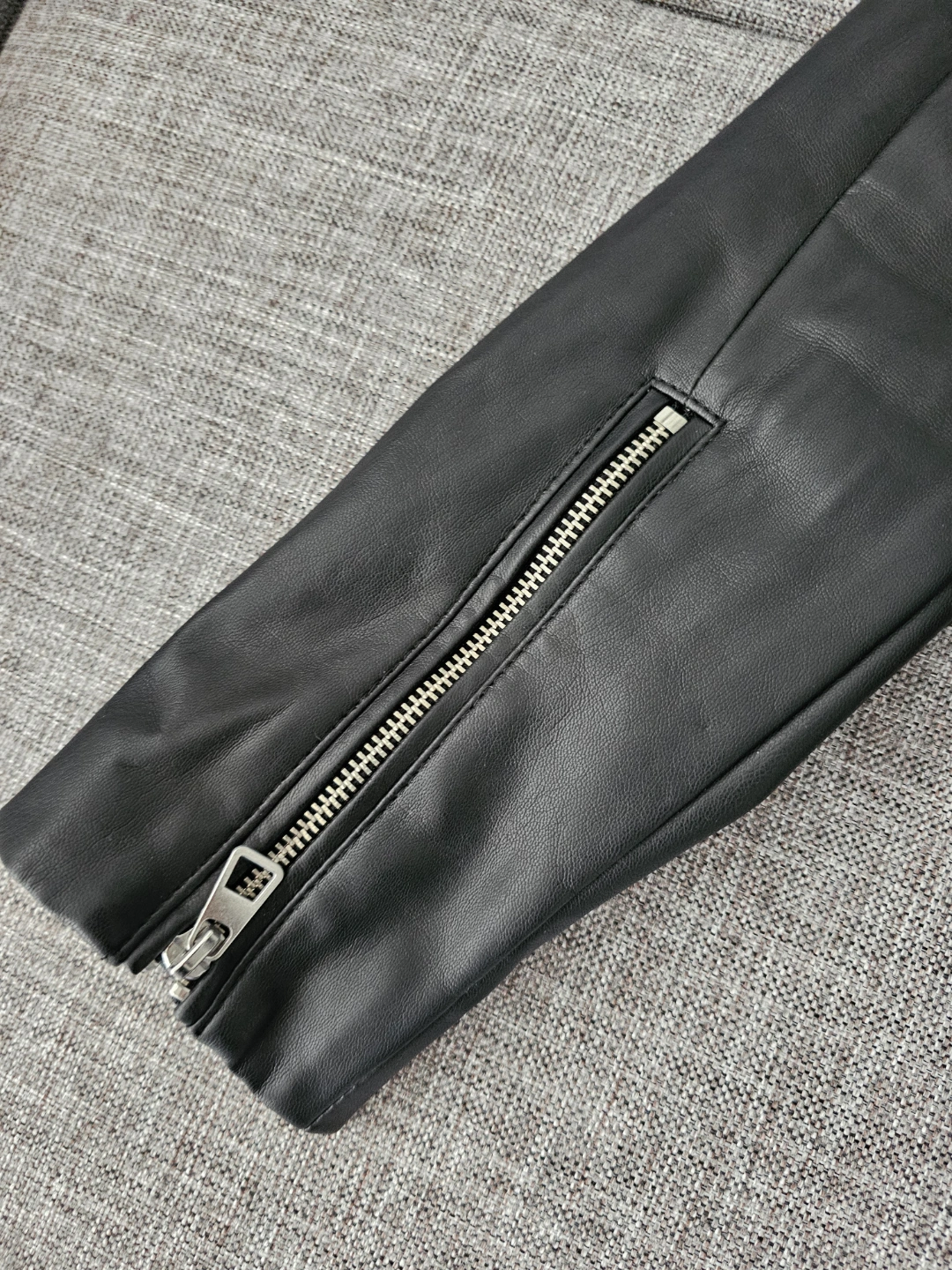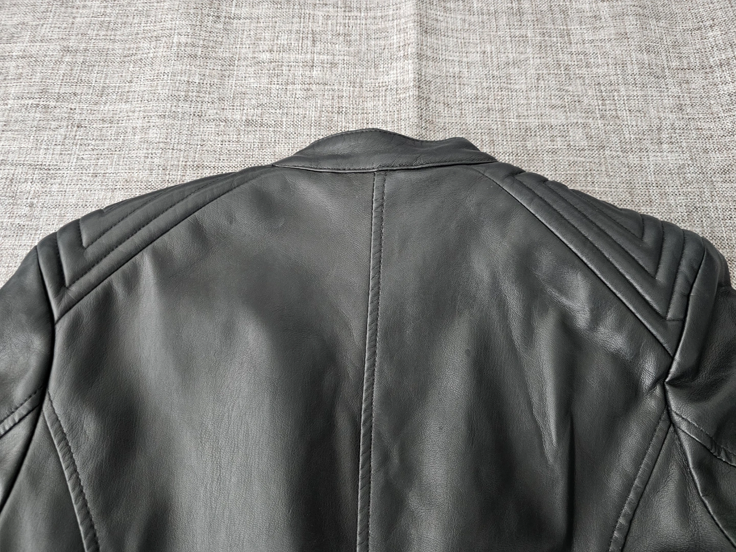 5Women's black faux leather moto jacket. Asymmetrical zipper closure. Multiple zippered pockets. Shoulder detailing. Slim fit.