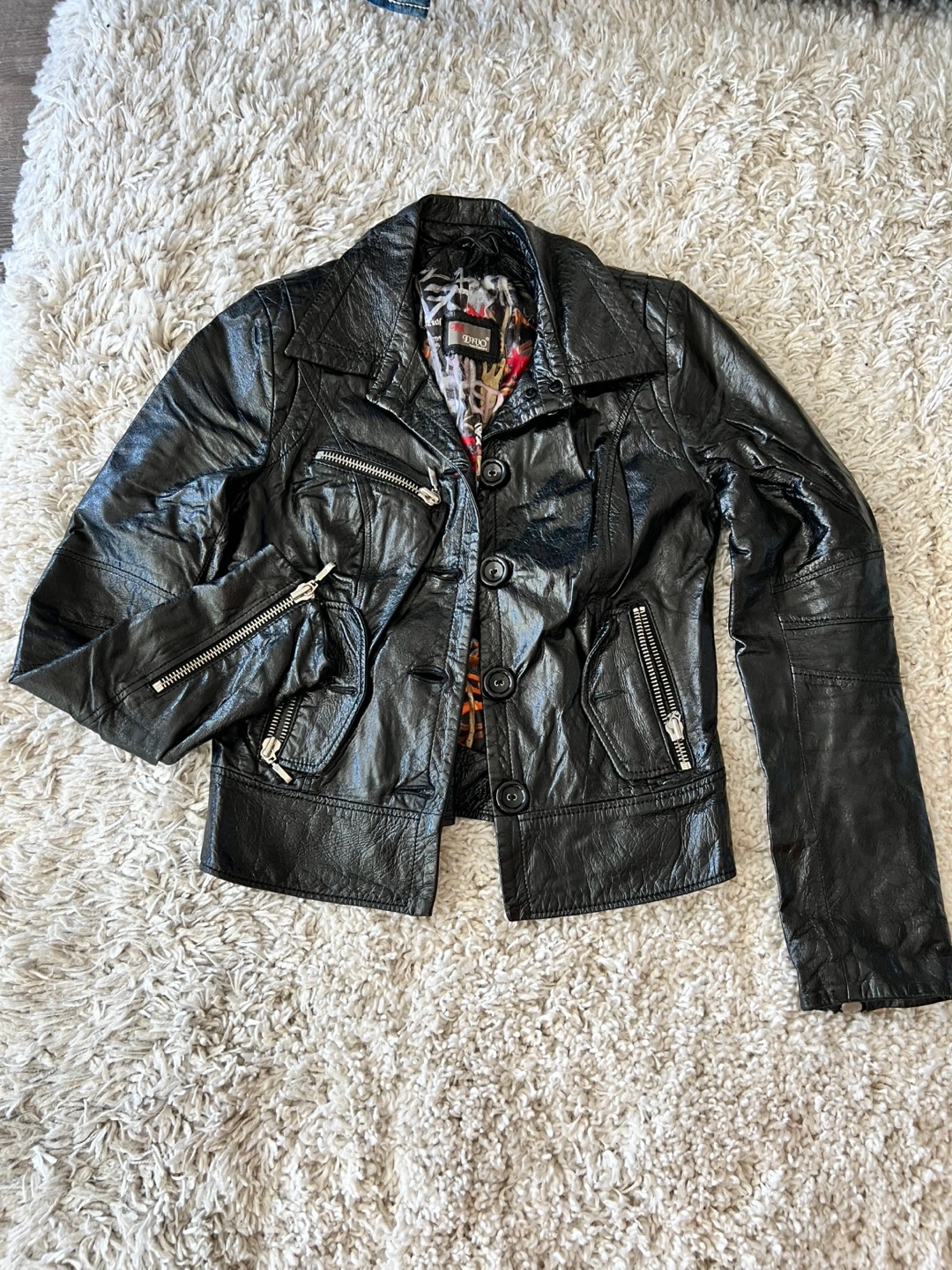 Here's a stylish black leather jacket . It features a unique lining and a flattering fit. Perfect for adding a touch of edge to any outfit