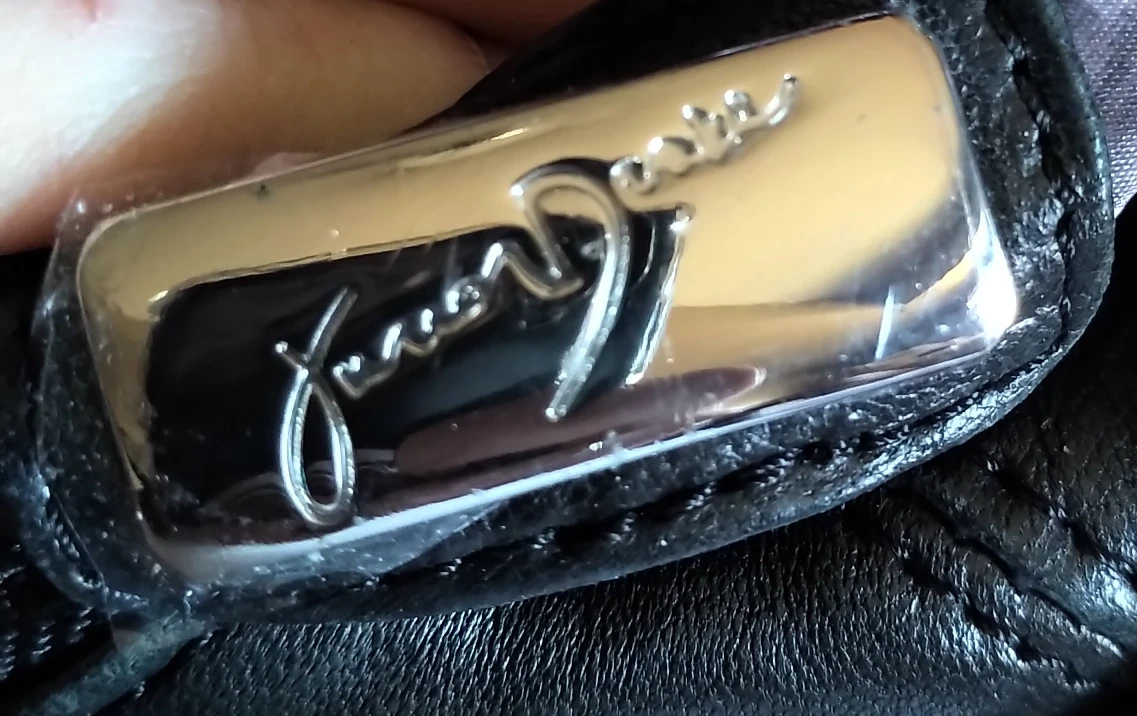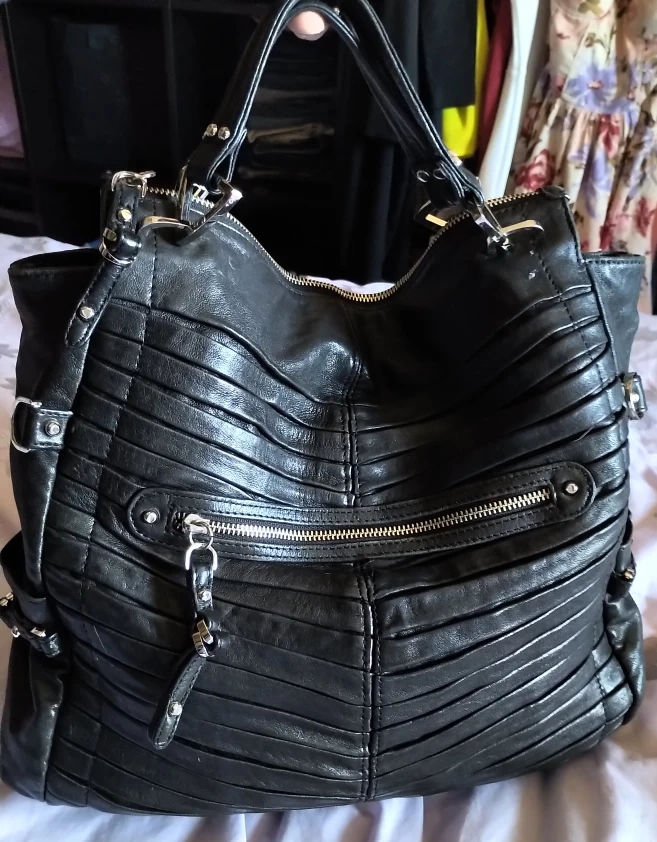 91Black leather large size purse with signature silk lining on the inside featuring one small inner zip pocket and on the outside has a pocket on each side of the purse and one large pocket on the back side that has a magnetic clasp. Approx 16"wide and 16" high with a zipper closure & silver tone hardware. Asking $100 (serious inquiries only please)
