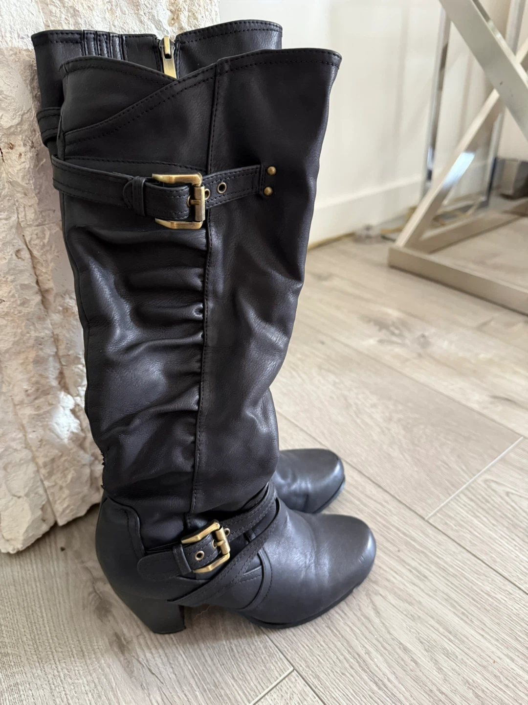 15Selling a pair of black leather knee-high boots in size 7. They feature a stylish design with buckle details and a comfortable heel height. Perfect for adding a touch of elegance to your outfit!