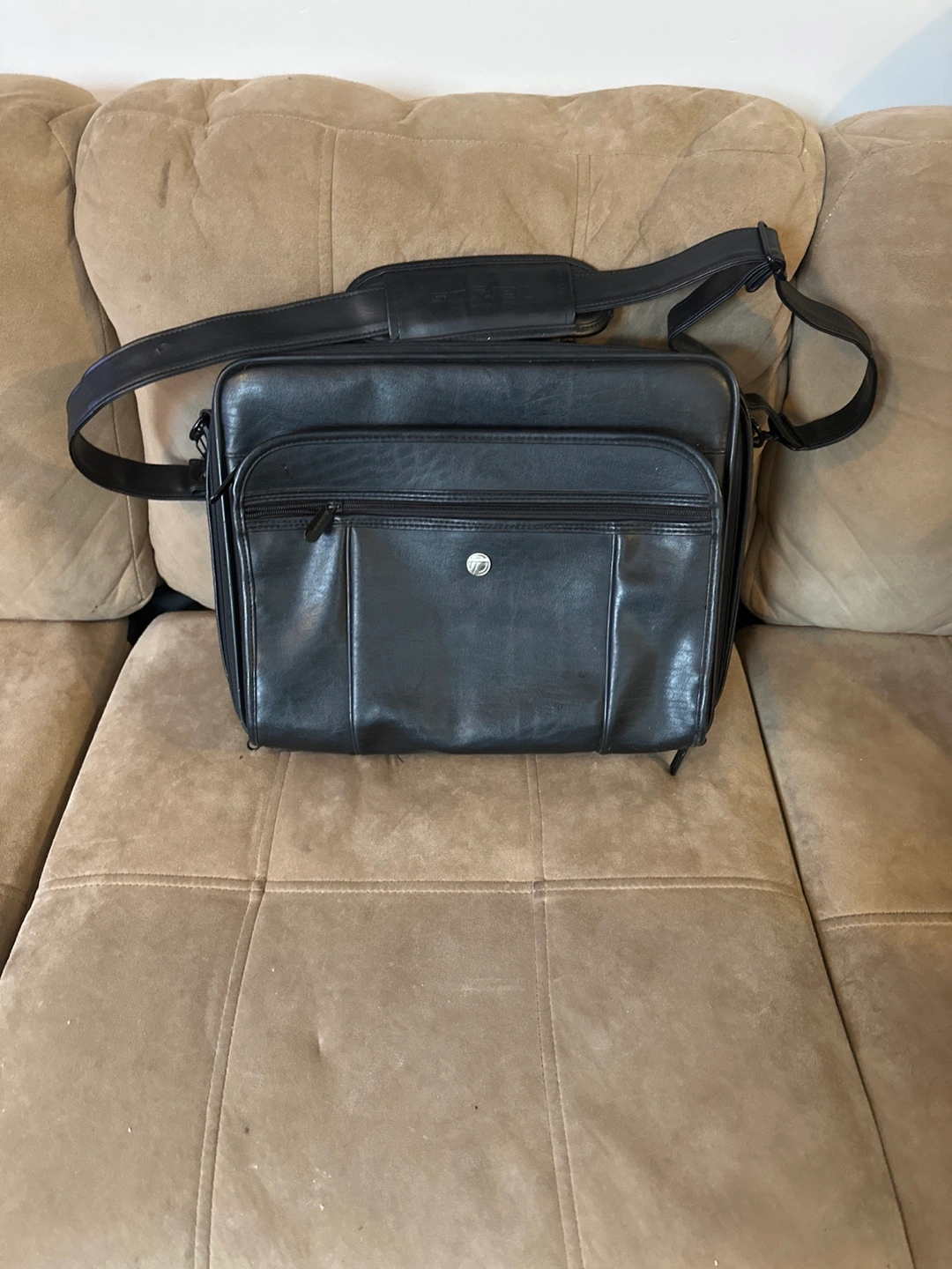 35Carry bag. Black leather-Adjustable shoulder strap. Multiple compartments. Zipper closure. Suitable for laptops and other accessories. $30 OBO