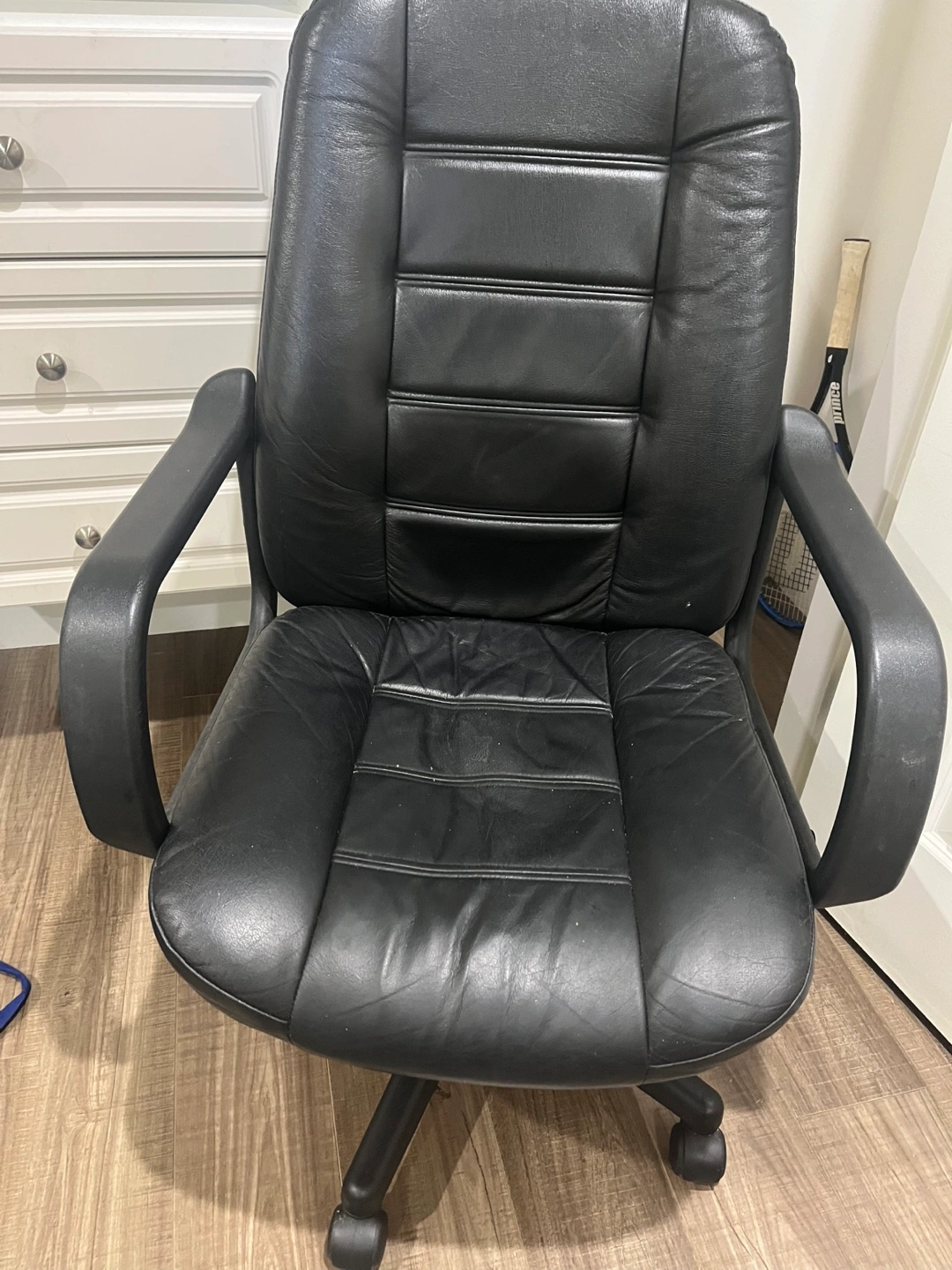 Selling a black leather office chair. It's in used condition, but still very functional. The hight is no longer adjustable but otherwise it’s a good choice. Perfect for a home office or study space!