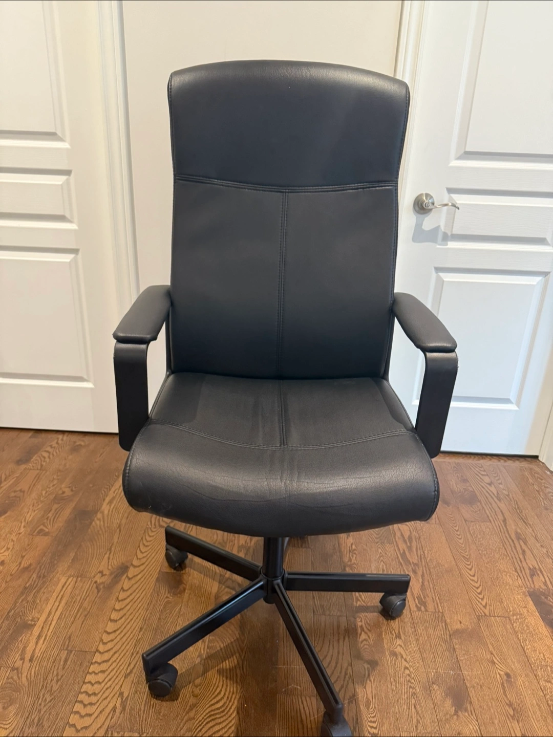 5Selling a comfortable black leather office chair. It's in good condition and ready for a new home! Perfect for your home office or study space. The chair features a sturdy base and adjustable height, ensuring a comfortable seating experience for long hours.