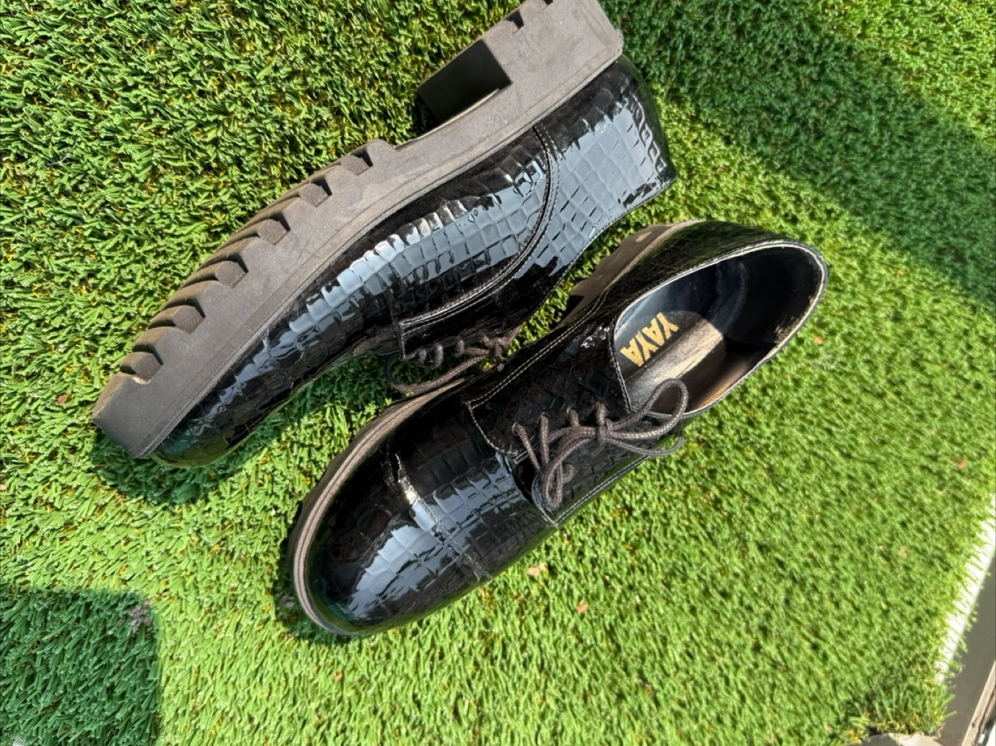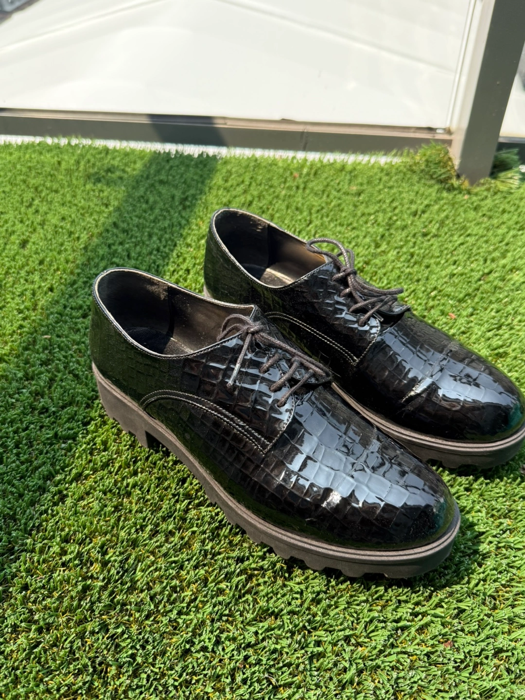 These are a pair of black leather oxfords! They have a unique textured design and are in great condition. Perfect for adding a touch of sophistication to any outfit