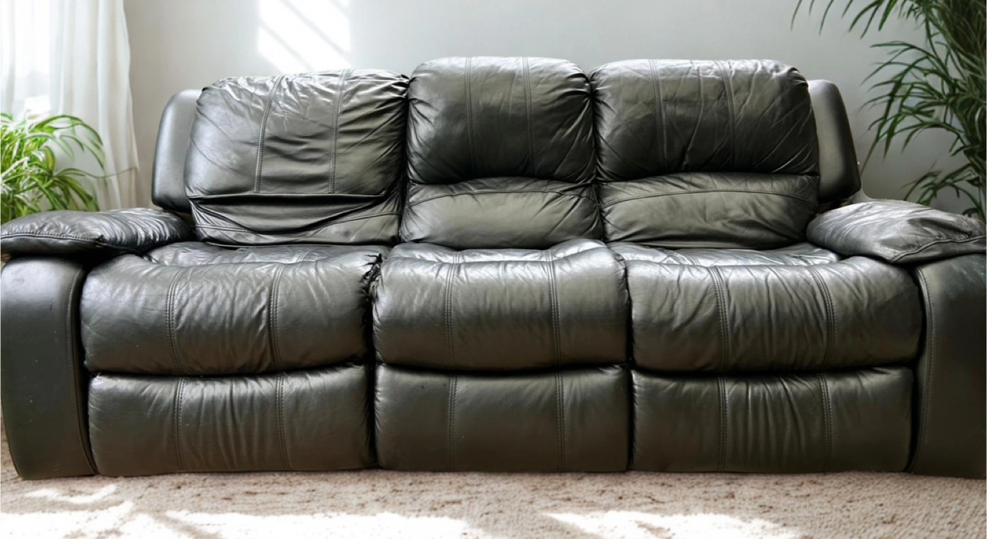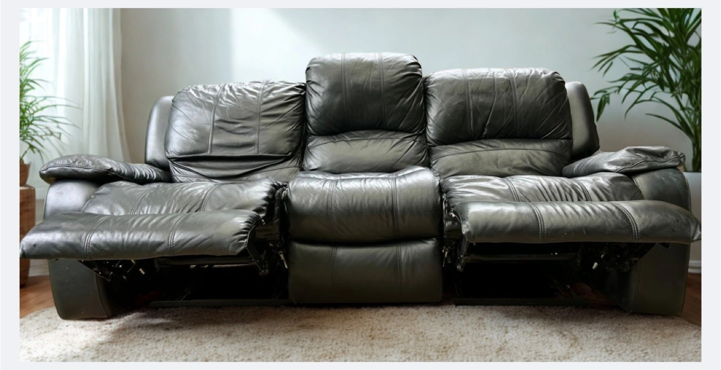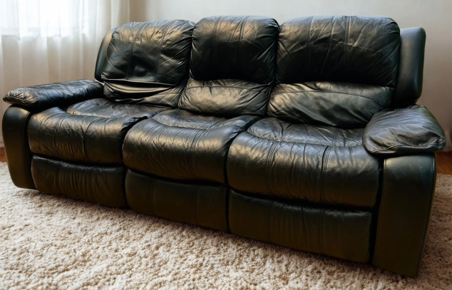 Selling a comfy black leather reclining sofa. It's a great piece for any living room. The sofa shows a sign of wear, but it's still very functional and comfortable for lounging and relaxing!