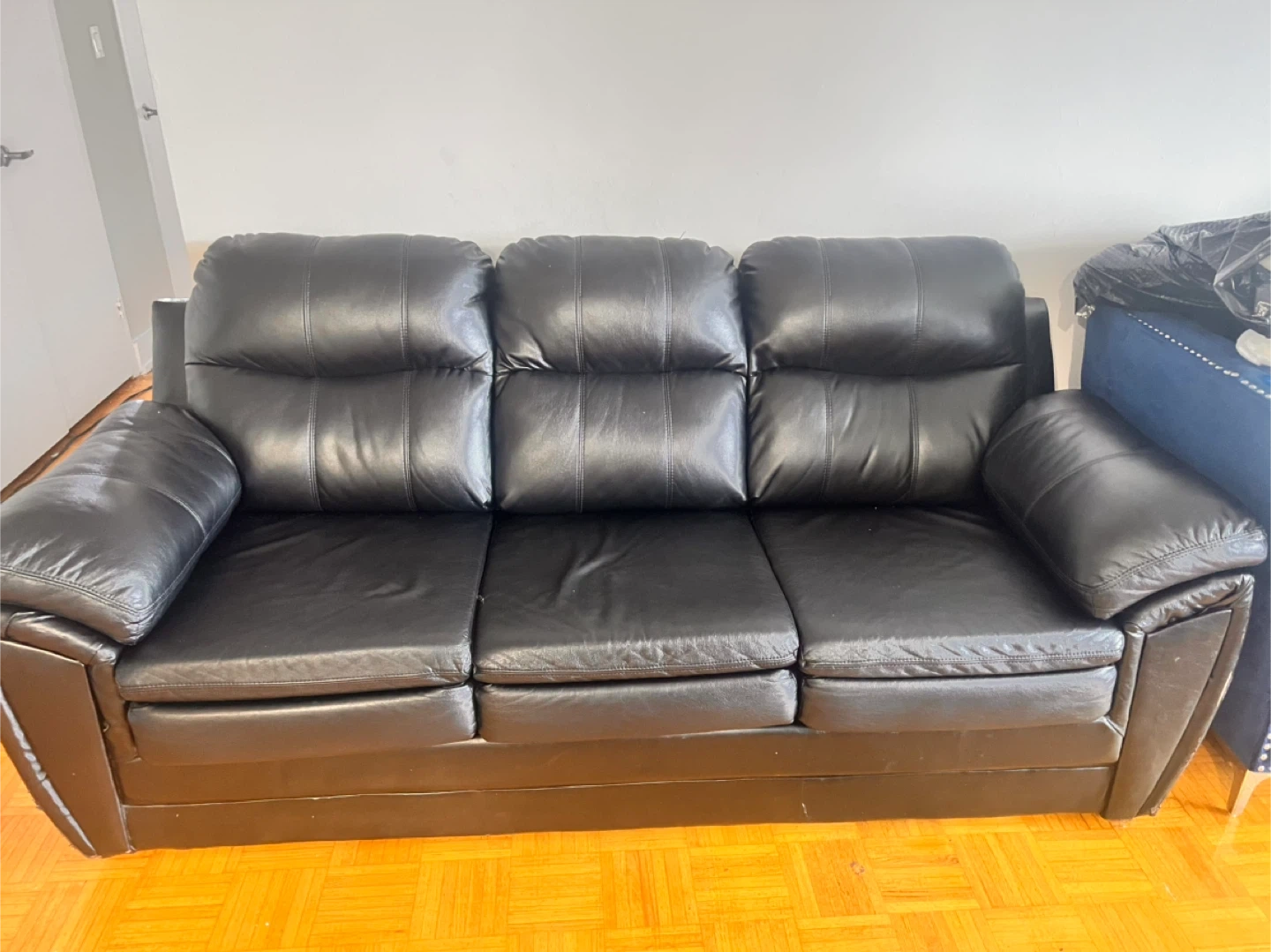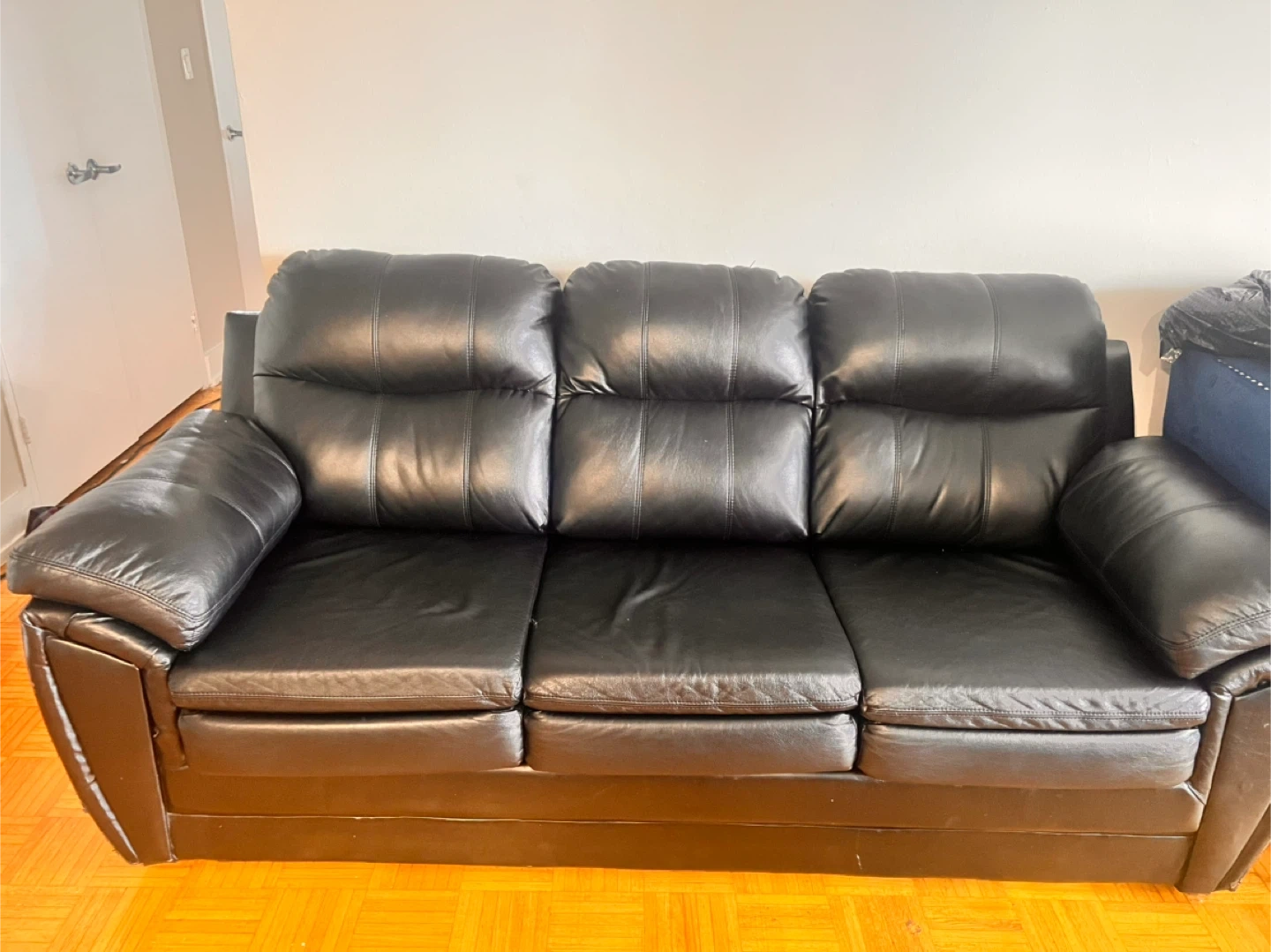 10Selling a comfy black leather sofa! It's in great shape and ready for a new home. Perfect for a living room or den, this sofa offers plenty of seating space for family and friends. The black leather gives it a sleek and stylish look that will complement any decor