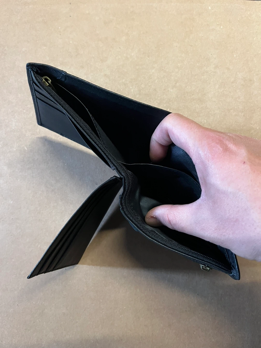 12Selling a simple black leather wallet. It features a zippered compartment and several slots for cards and cash. It's in great condition and ready for a new home!