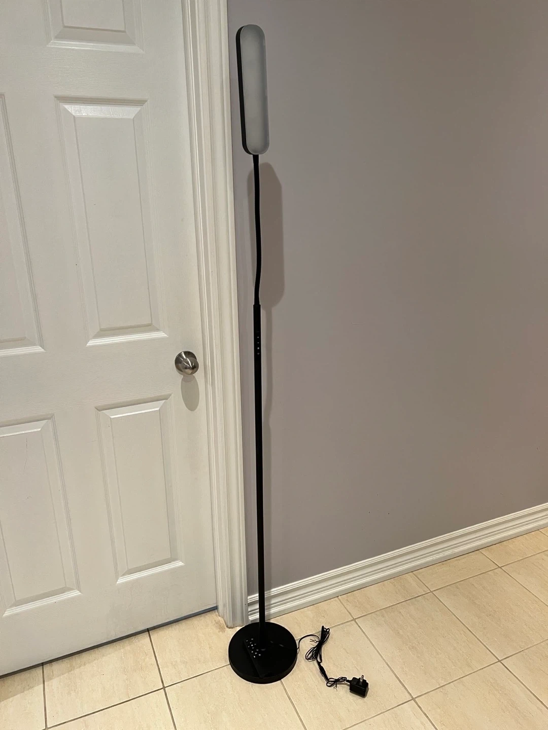 189Selling a sleek black LED floor lamp. It's in great condition and ready to brighten up your space! The lamp features adjustable height, as shown in the pictures, and comes with a remote and power adapter