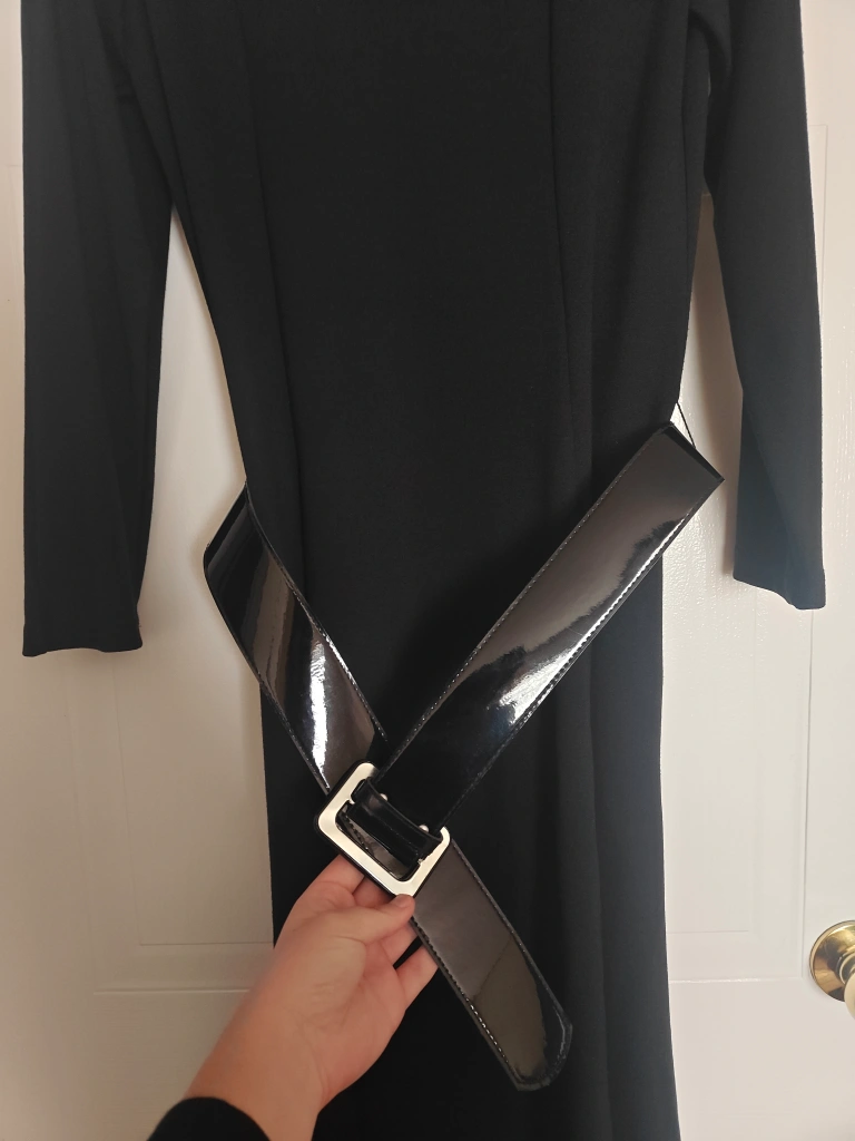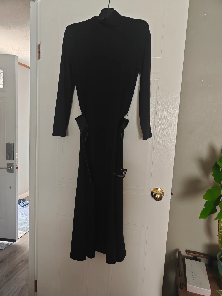 Selling a stylish black long sleeve dress. It features a belt to cinch the waist and give a flattering silhouette. Perfect for a night out or a special occasion! Mock neck, quarter sleeves, and midi length.