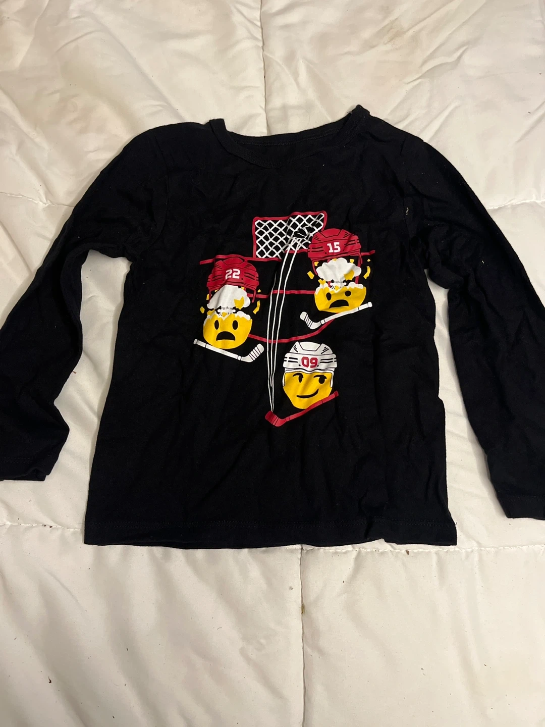 65Selling a black long sleeve shirt! It features a fun hockey emoji design on the front. It's in great condition and perfect for any young hockey fan