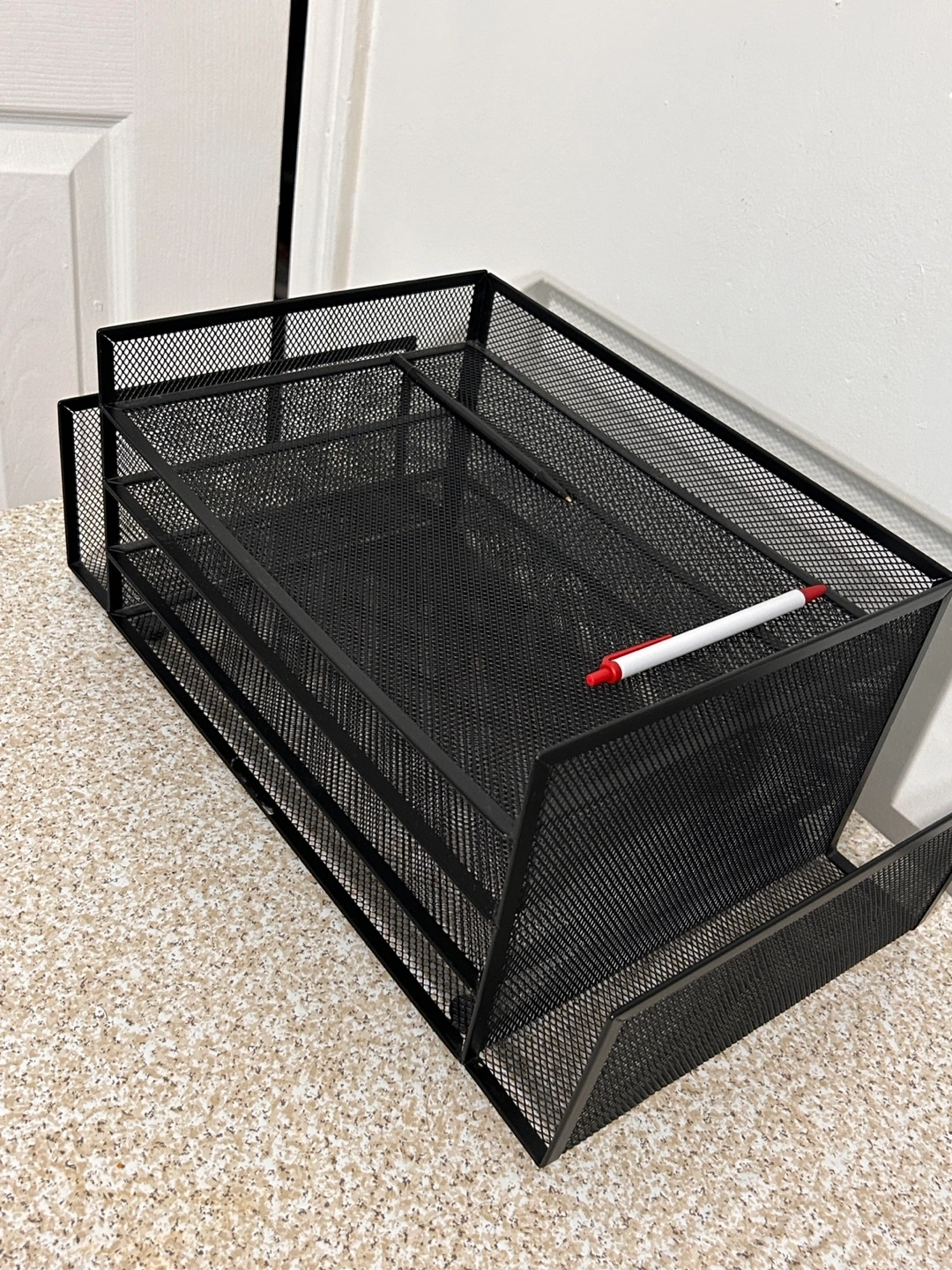 181Declutter your workspace with this handy black mesh desk organizer! It's perfect for keeping your papers, files, and stationery neatly arranged. This organizer is in great condition and ready to help you stay productive.