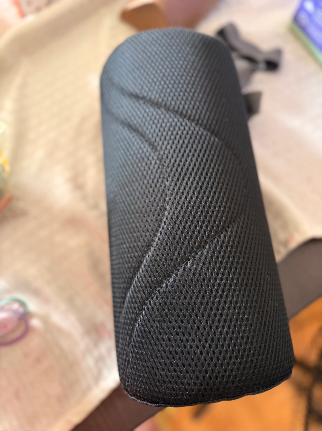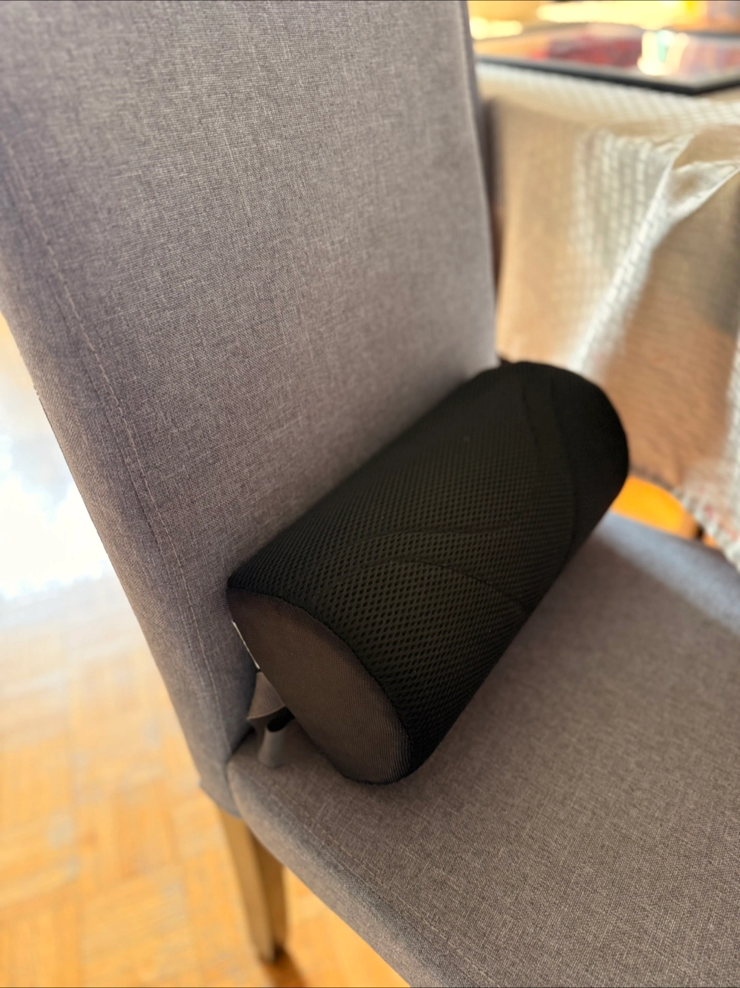 Here's a black mesh lumbar support roll cushion. It's great for adding a bit of extra comfort and support to your chair at home or in the office. It's in great condition and ready to use!