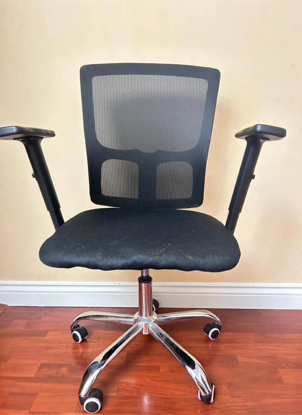 10Selling a black mesh office chair. It's in good condition and ready for a new home office! The chair features a breathable mesh back and adjustable armrests for added comfort. It also has a sturdy base with smooth-rolling casters and height can be adjusted too
