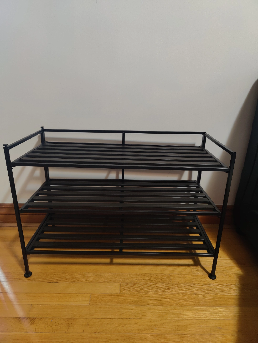 Selling a simple black metal shoe rack! It has three tiers, so there's lots of space for all your footwear. It's in great condition and ready to help organize your entryway or closet