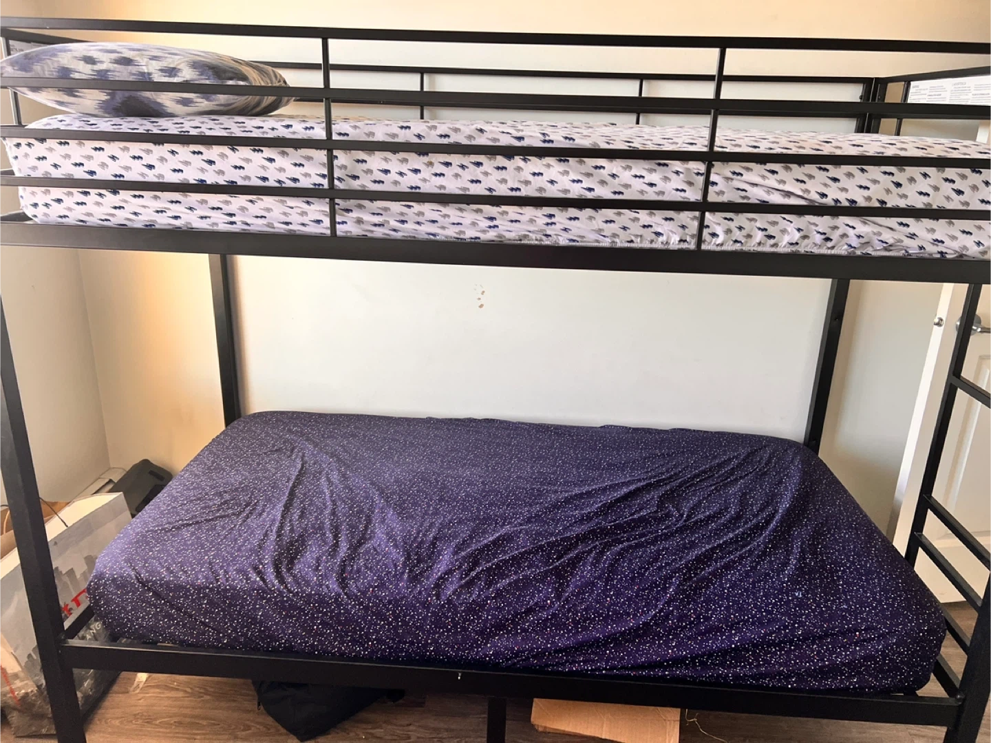 10Selling a bunk bed frame in great condition! It's a sturdy metal frame, perfect for saving space. The frame is black and comes with all the necessary parts for assembly. Mattresses and bedding not included.