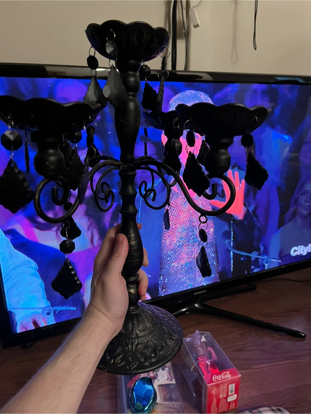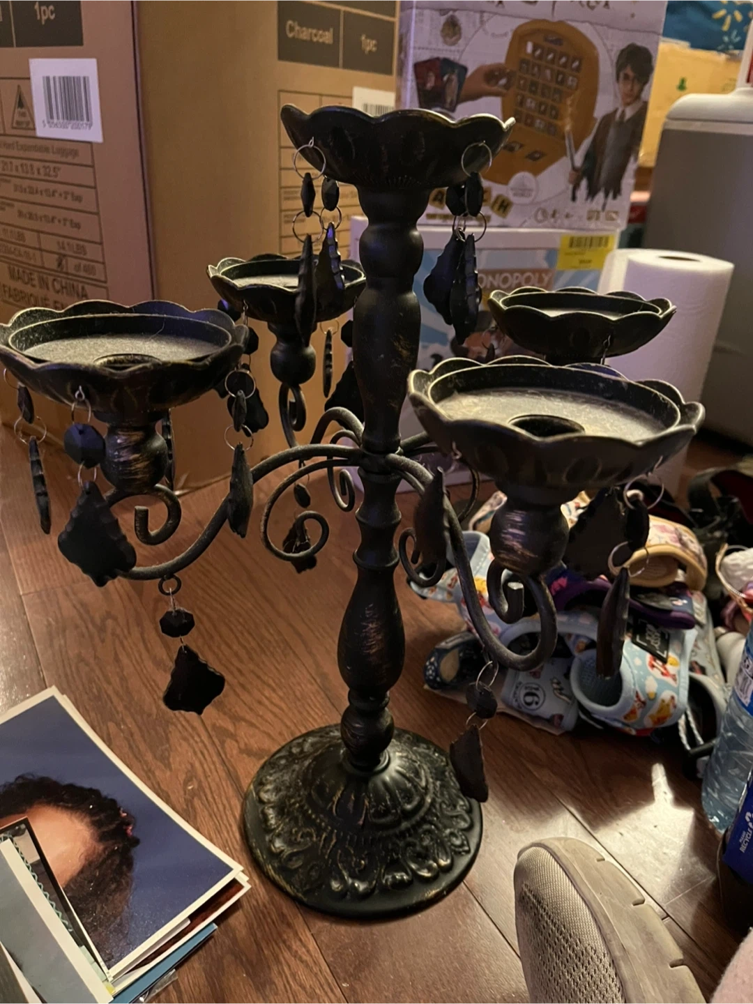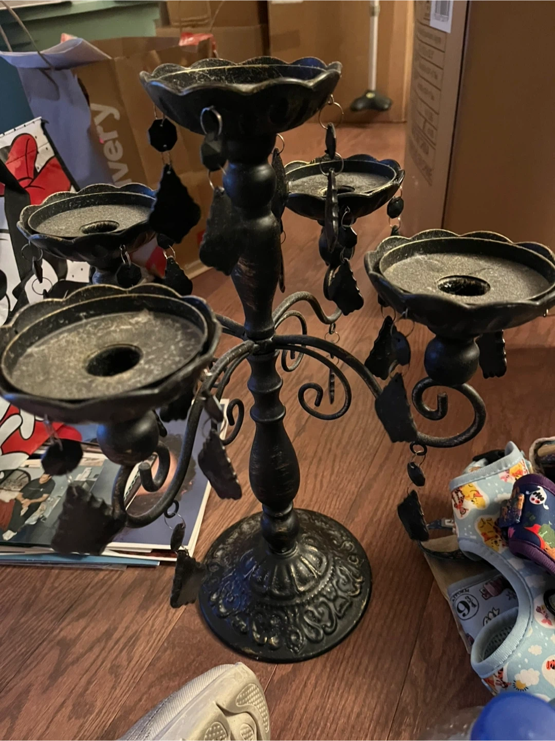 123Selling a black metal candle holder. It has a vintage look with decorative accents. It will look great in any room!