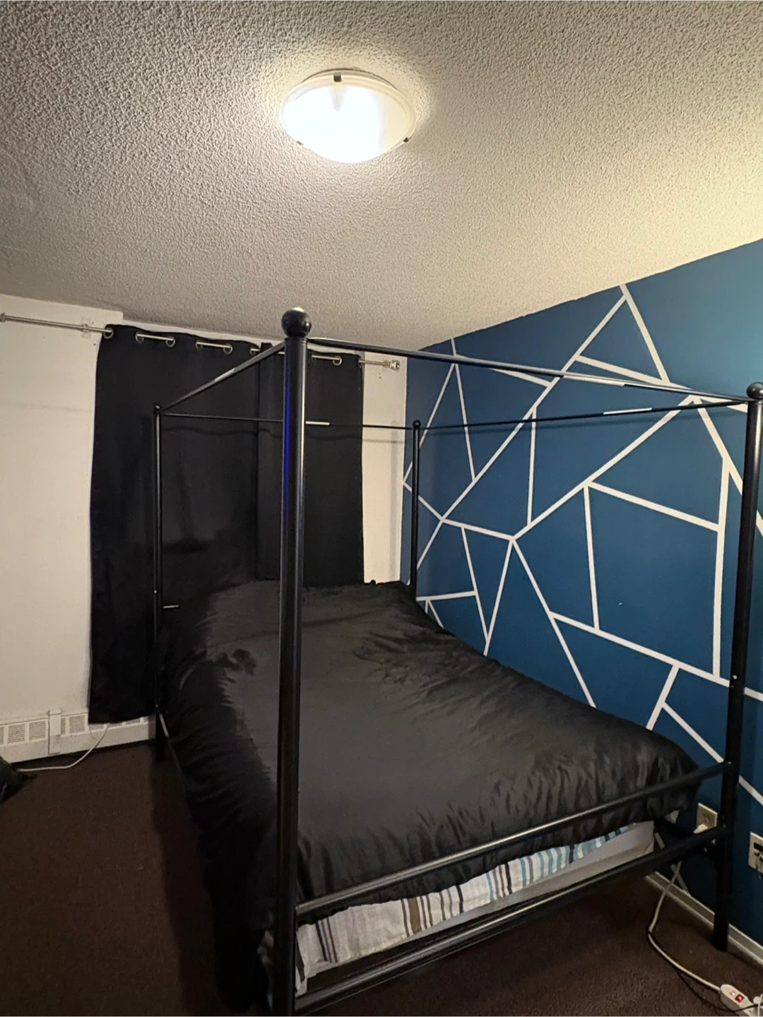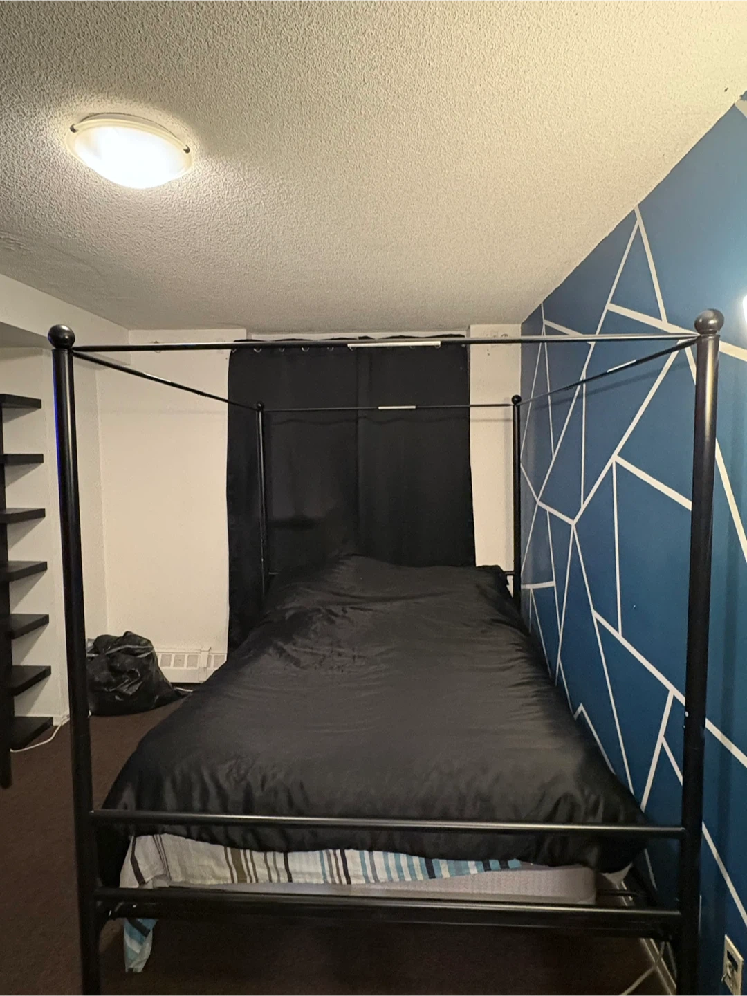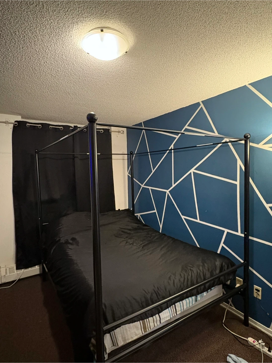 Selling a black metal canopy bed frame. It's in great shape and ready for a new home! Perfect for adding a touch of elegance to your bedroom. Please note that the mattress is not included.