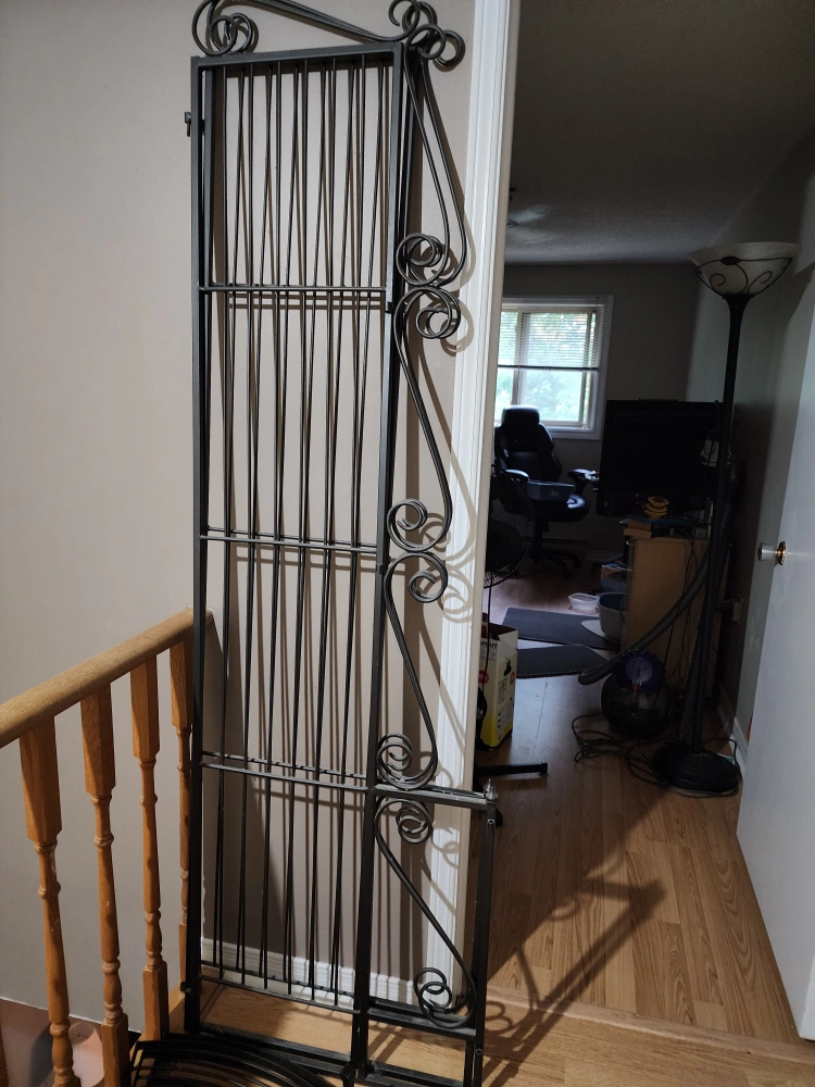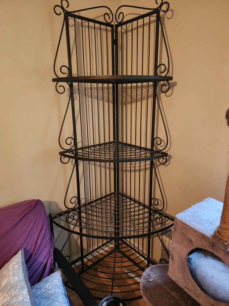 Selling a black metal corner shelf. It's in great shape and would be a lovely addition to any room. It has four shelves, perfect for displaying plants, books, or other decorative items. The metal frame is sturdy and features a decorative design.