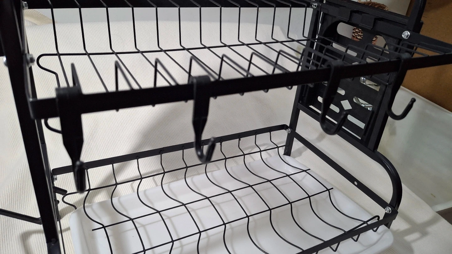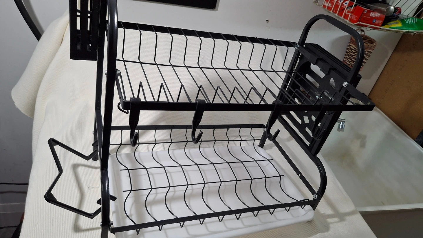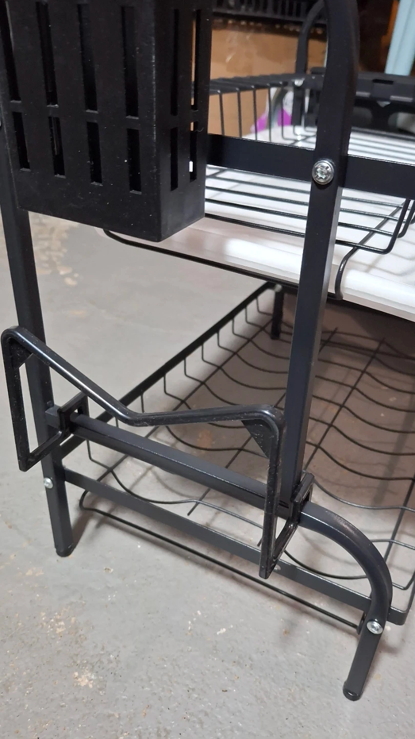 1000+Selling a black metal dish drying rack. Includes cutlery basket, cutting board holder, four hooks, drip tray and a knife holder 16.5" x 9" Height 15" New