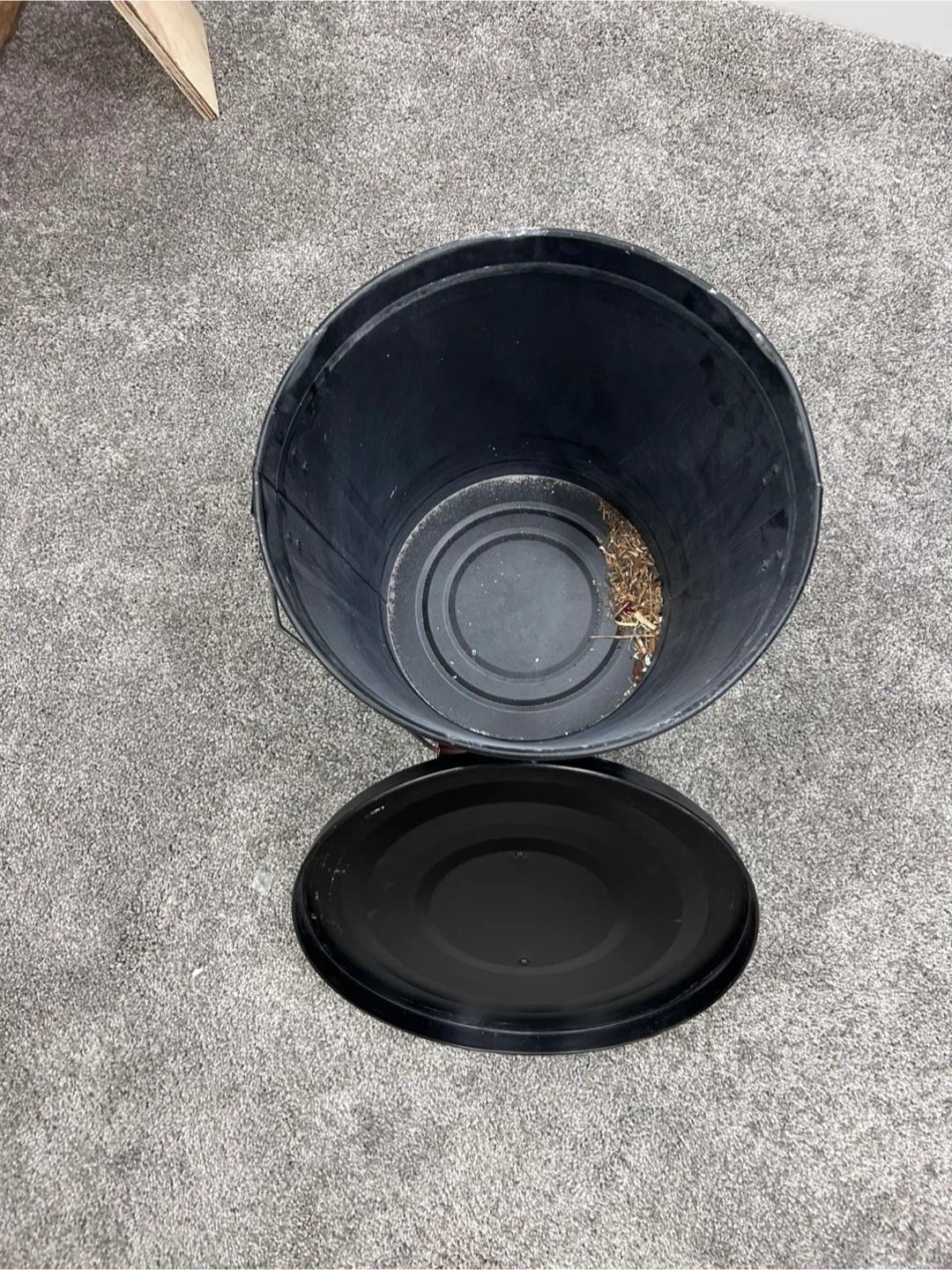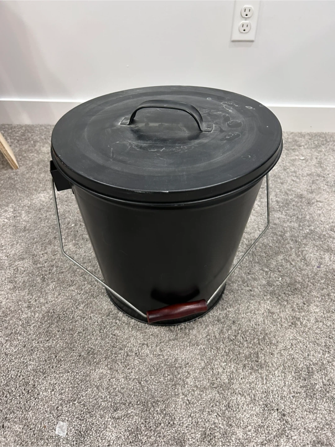 Selling a used black metal ash can, complete with a lid. It's in good condition and ready for your fireplace or firepit!