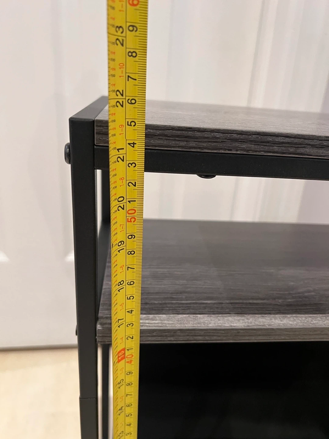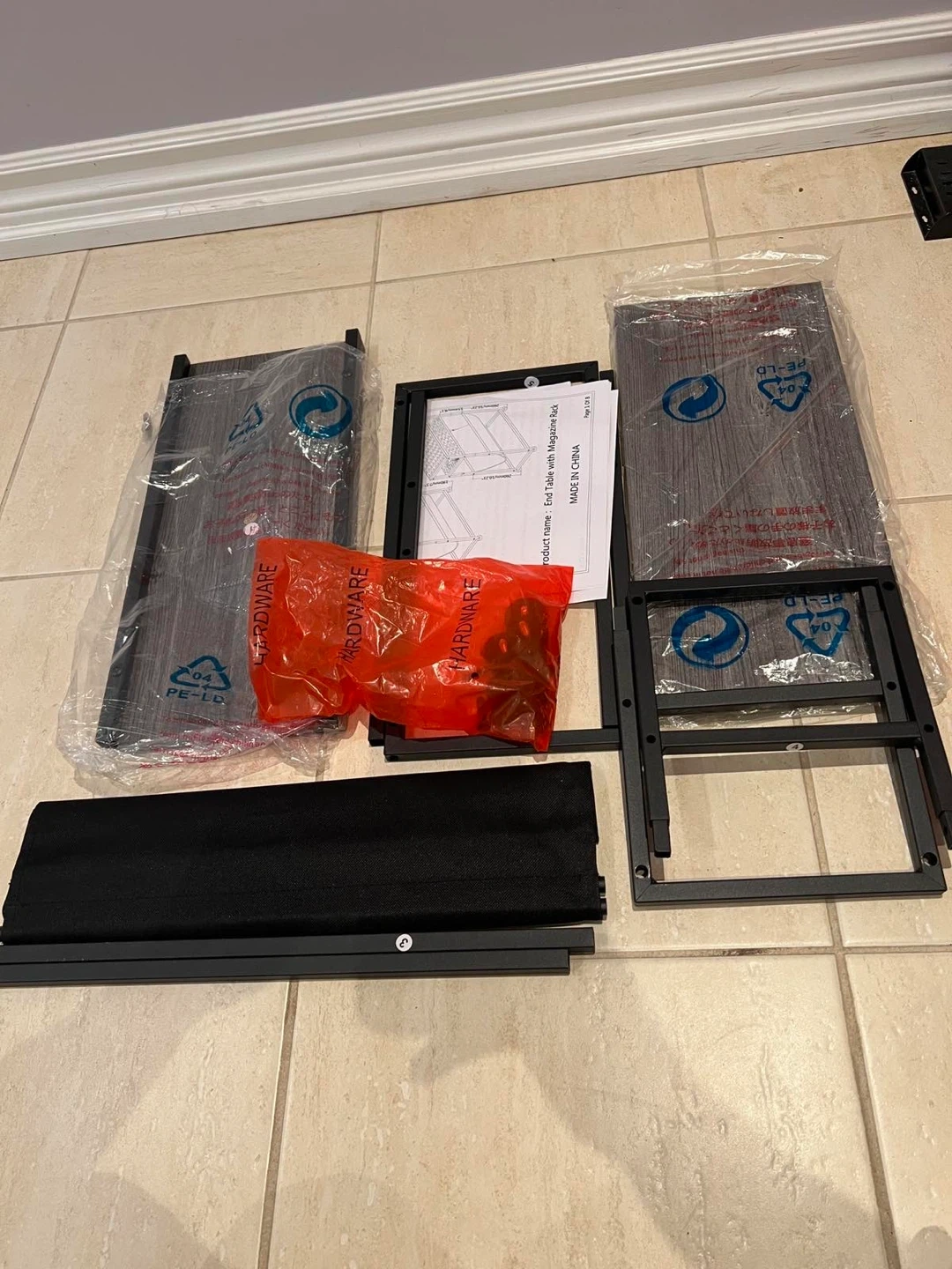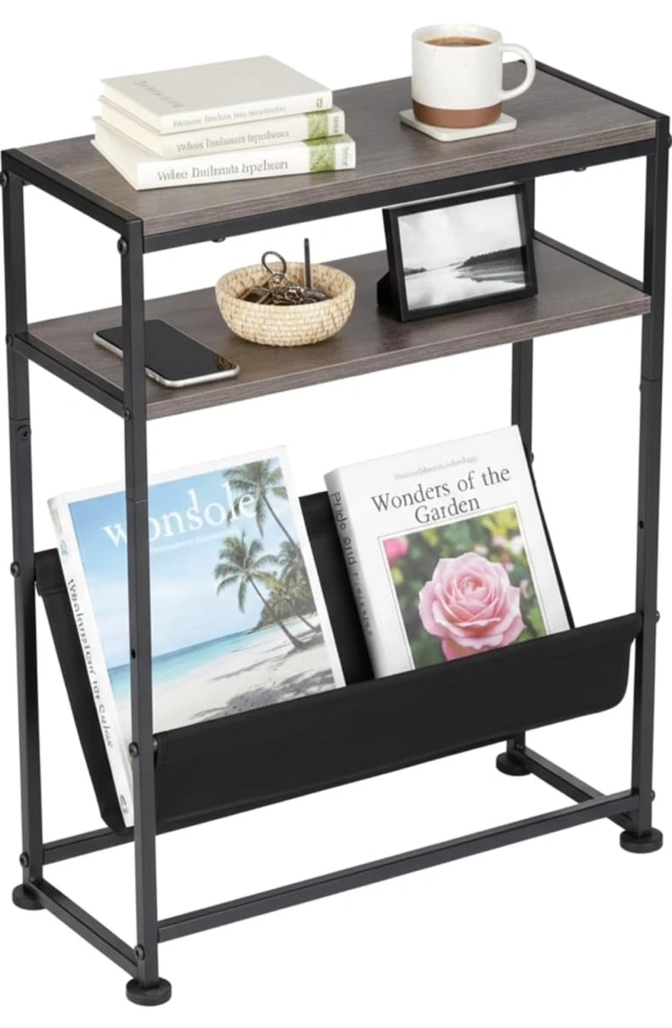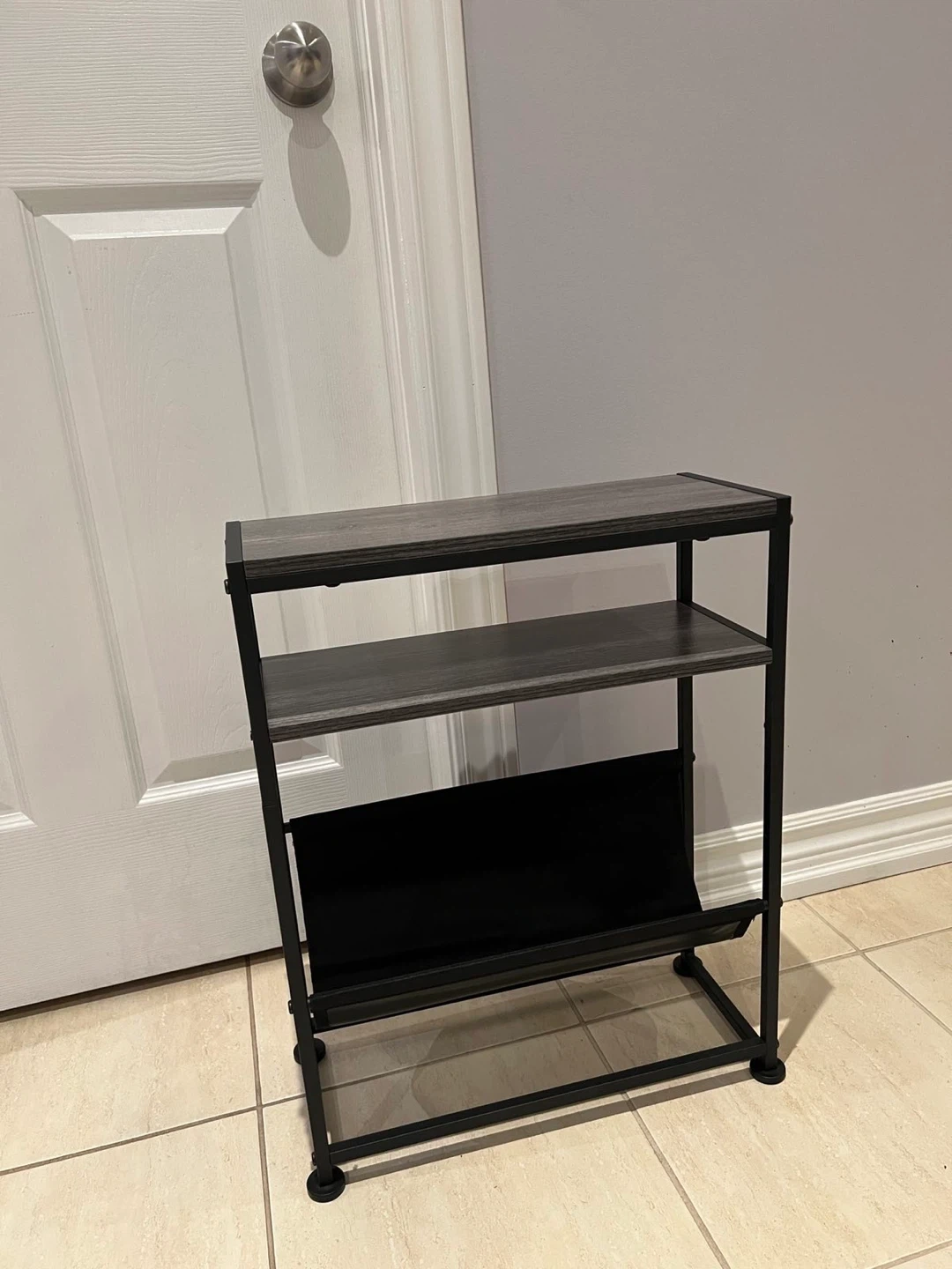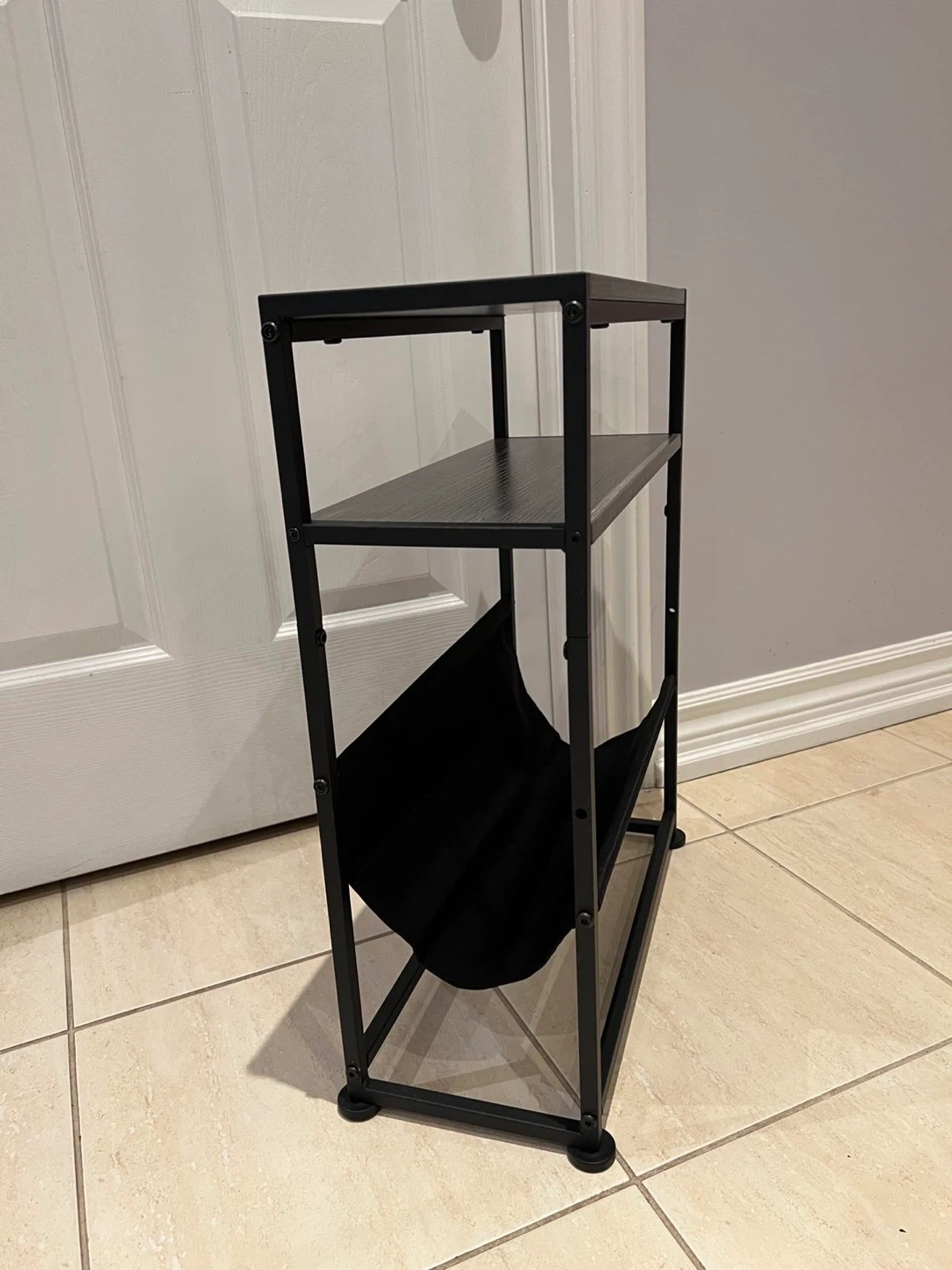 179Here's a handy black metal frame magazine rack for your home! It features two shelves and a fabric sling for holding magazines or books. It's in great shape and ready to add some organization to your space
