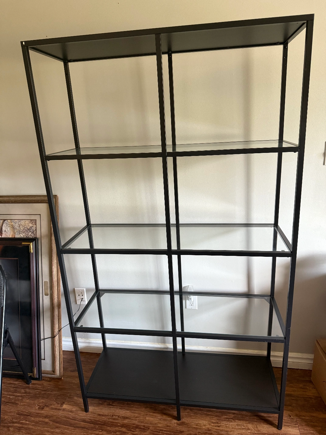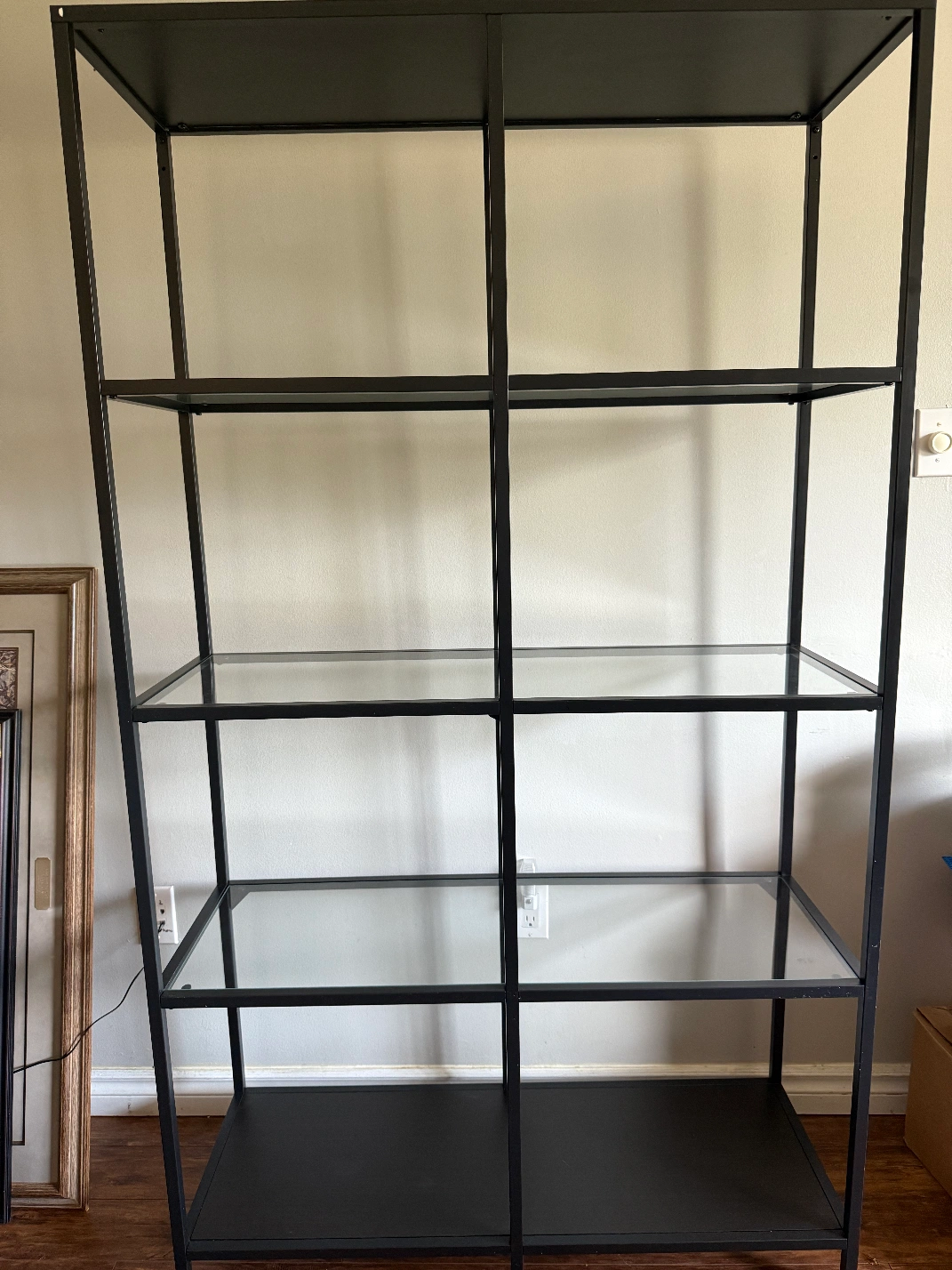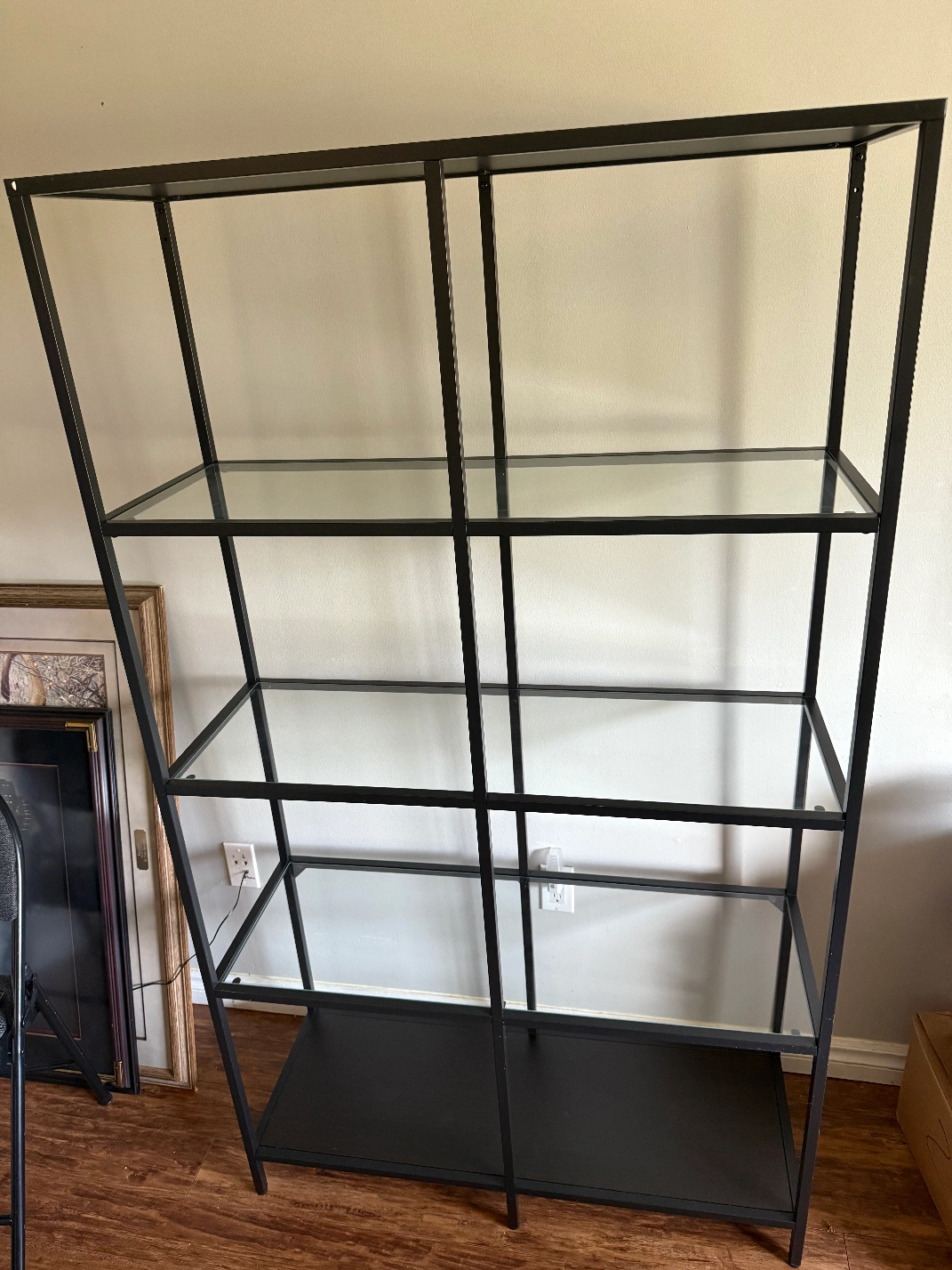 Selling a sleek black metal shelf unit with glass shelves. It's in great shape and would be a stylish addition to any room. Perfect for displaying books, plants, or other decorative items!