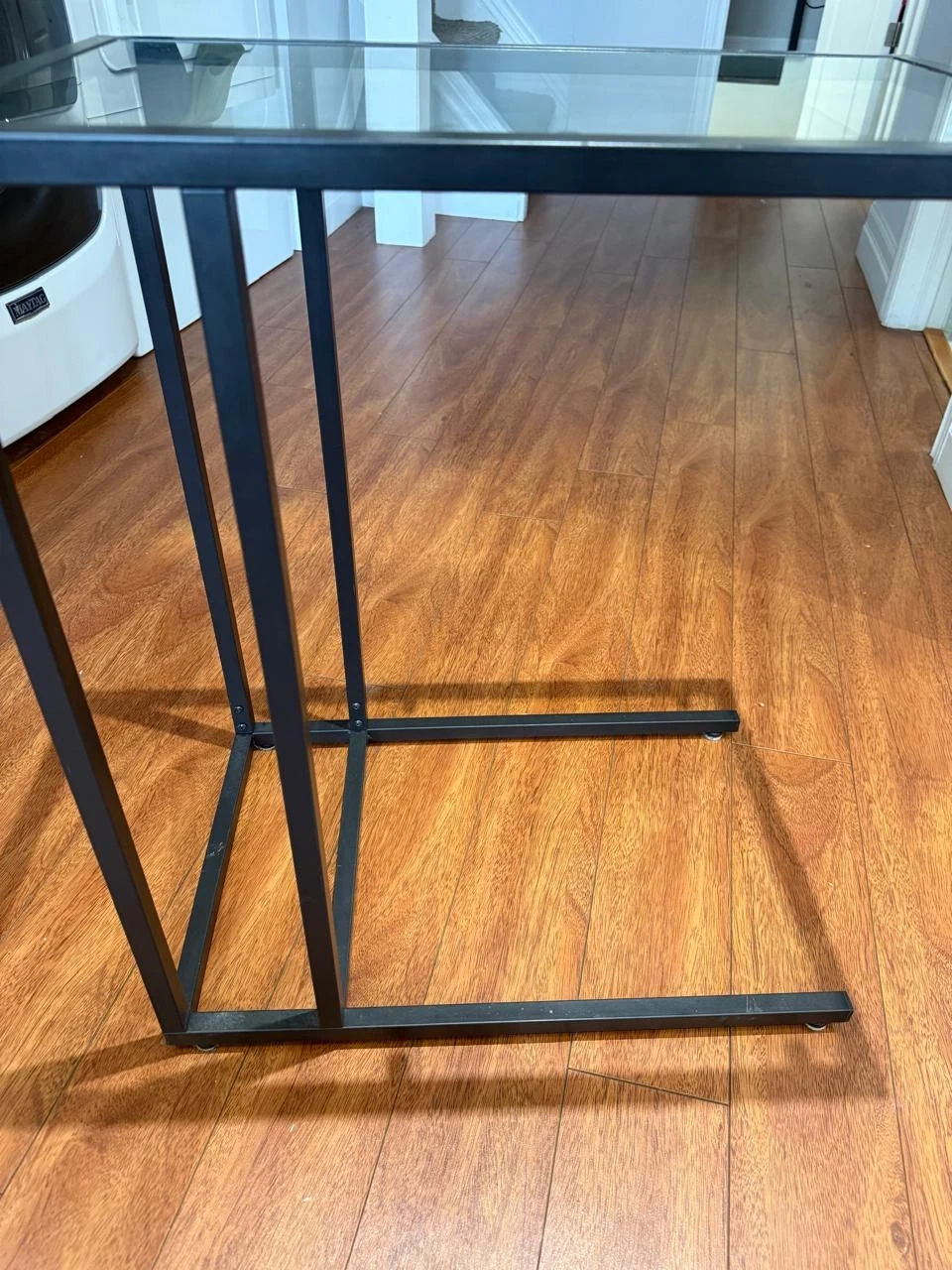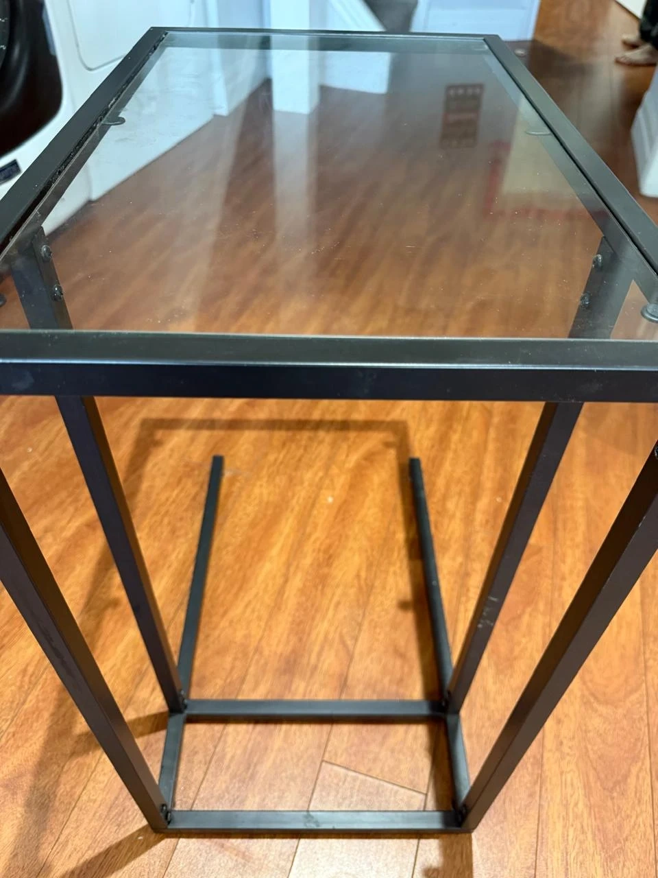 60Selling a sleek side table with a black metal frame and a glass top. It's in good condition and would be a great addition to any living room or bedroom