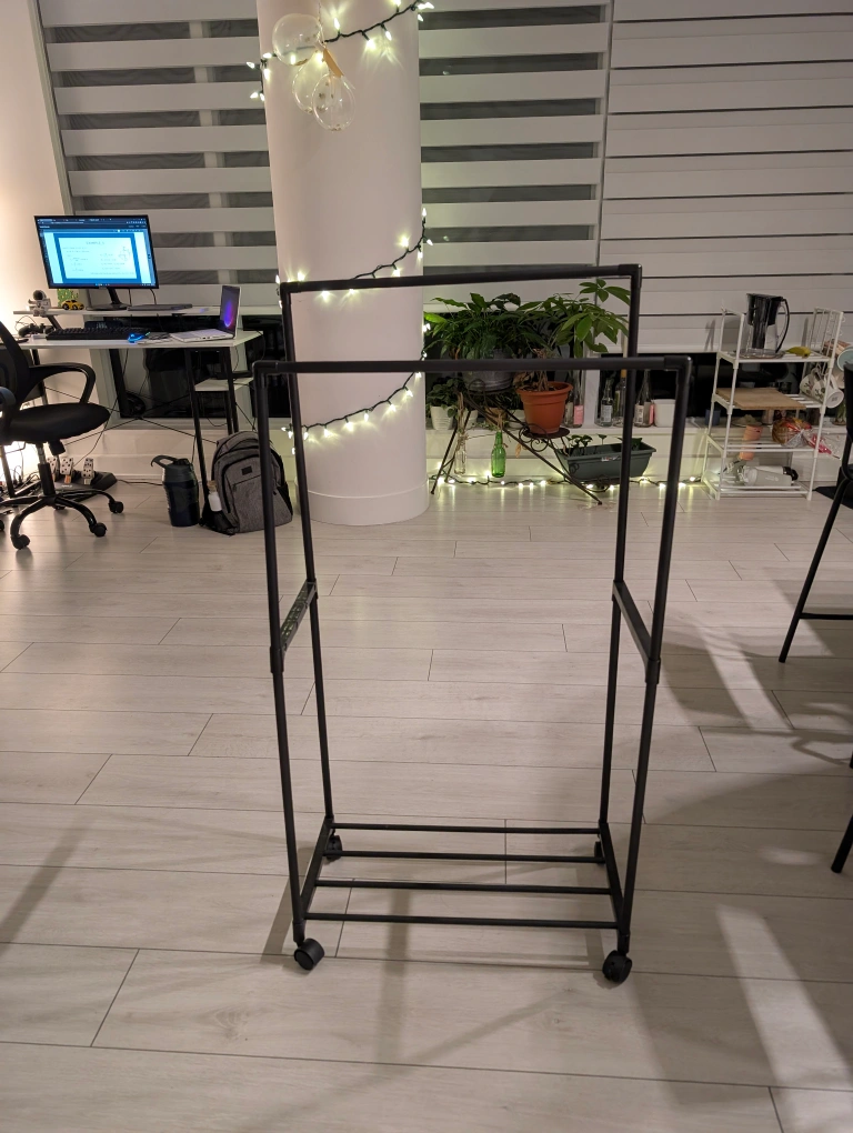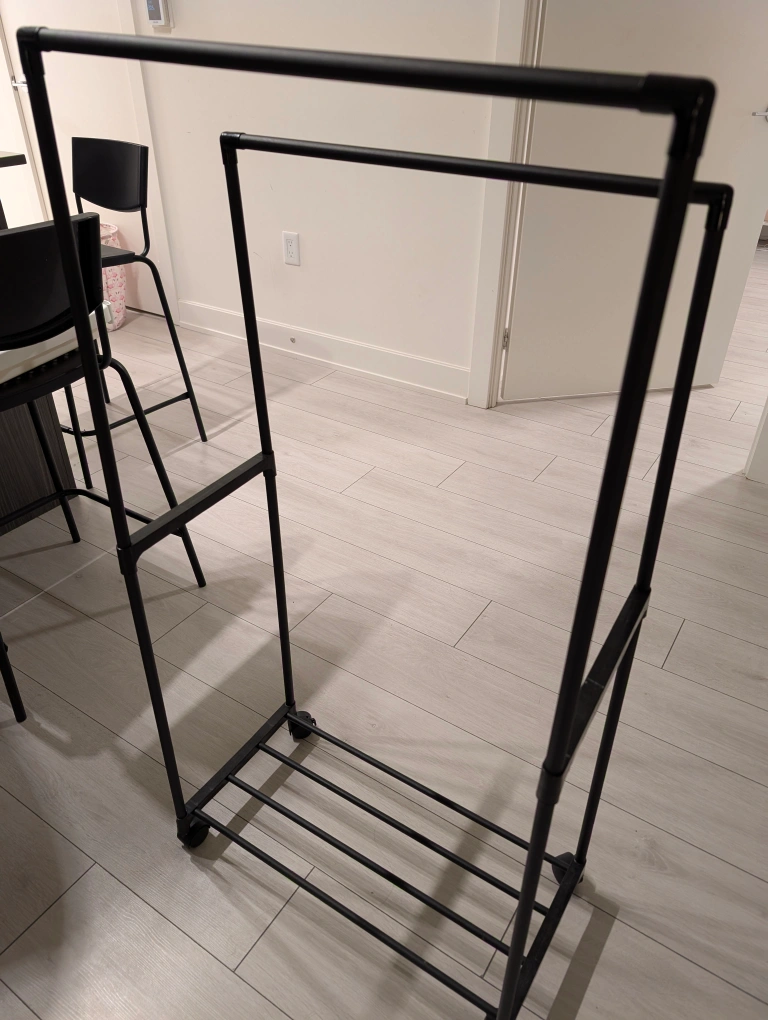 109Double hanging rod. Bottom shelf for storage. Four rolling casters, one is a bit tarnished in appearance but no problem in support. Easy assembly and storage.