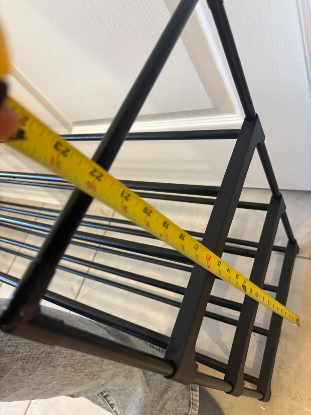 I have a black metal shoe rack for sale. It's in great shape and ready to organize your shoes! It measures approximately 47 inches tall, 23 inches wide, and 12 inches deep