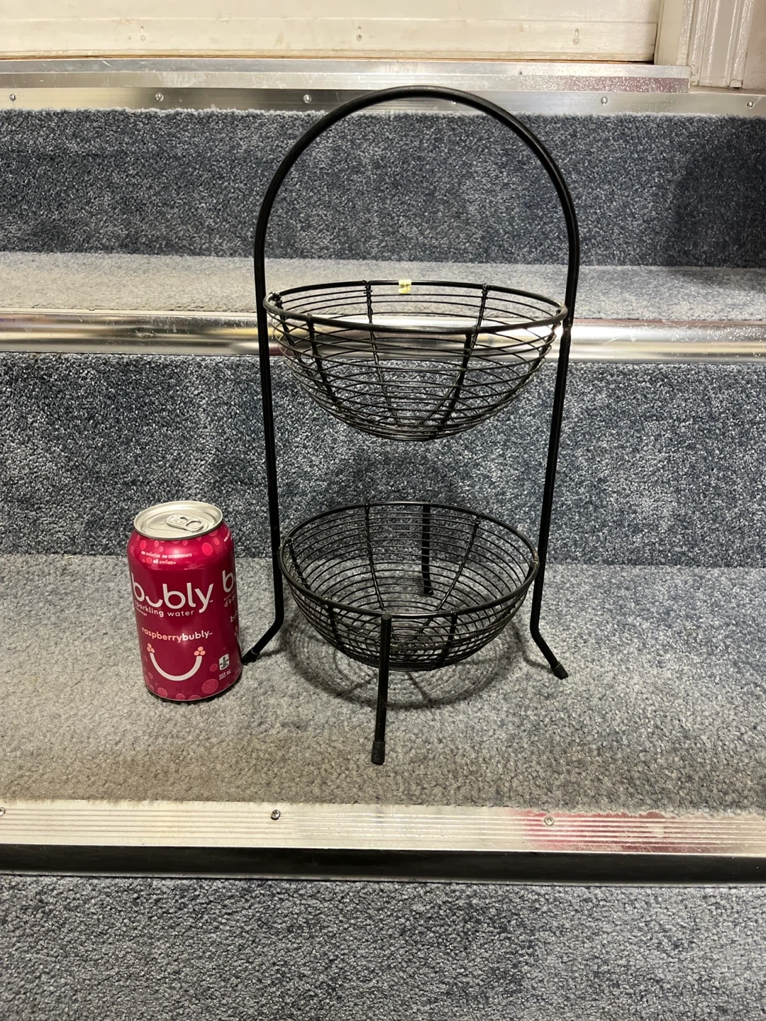 15Selling a cute black metal two-tier basket stand! It's perfect for storing fruits, vegetables, or other household items. It's in great condition and ready for a new home