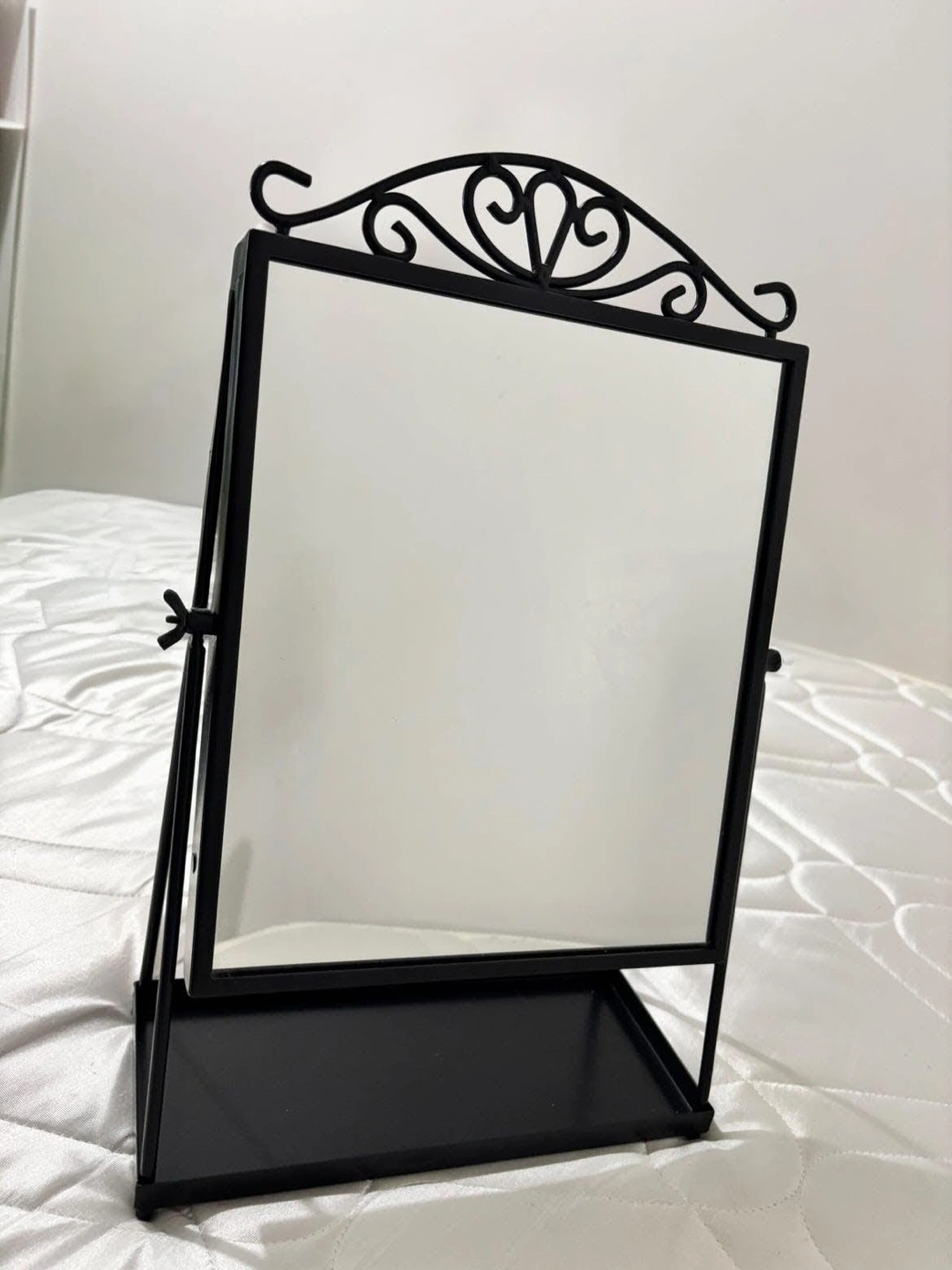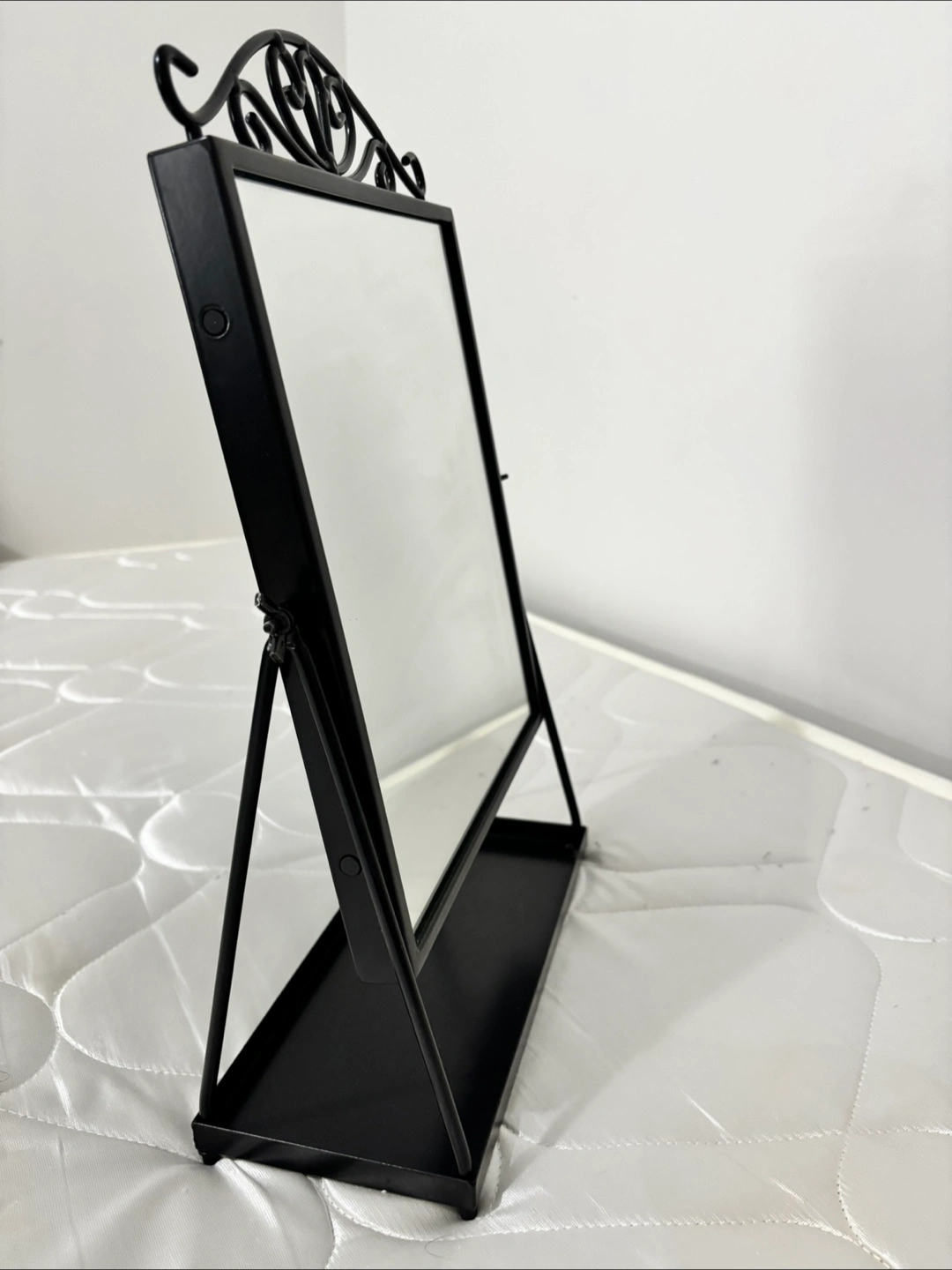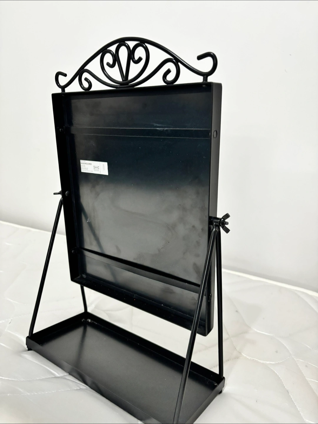 5Ornate black metal frame. Small tray at the bottom. Perfect for a dresser or vanity. Adjustable stand.