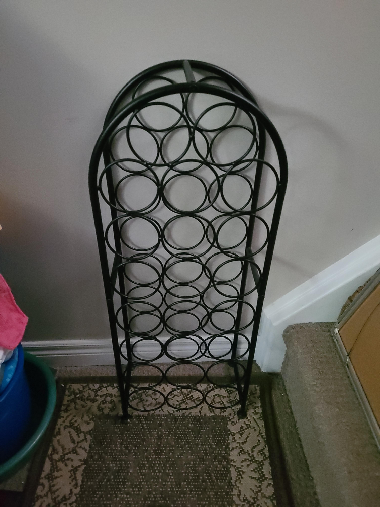 76Here's a sturdy black metal wine rack ready for a new home! It can hold up to 23 bottles of your favourite wine, and it's in great condition. Perfect for adding a touch of elegance to your dining area or kitchen