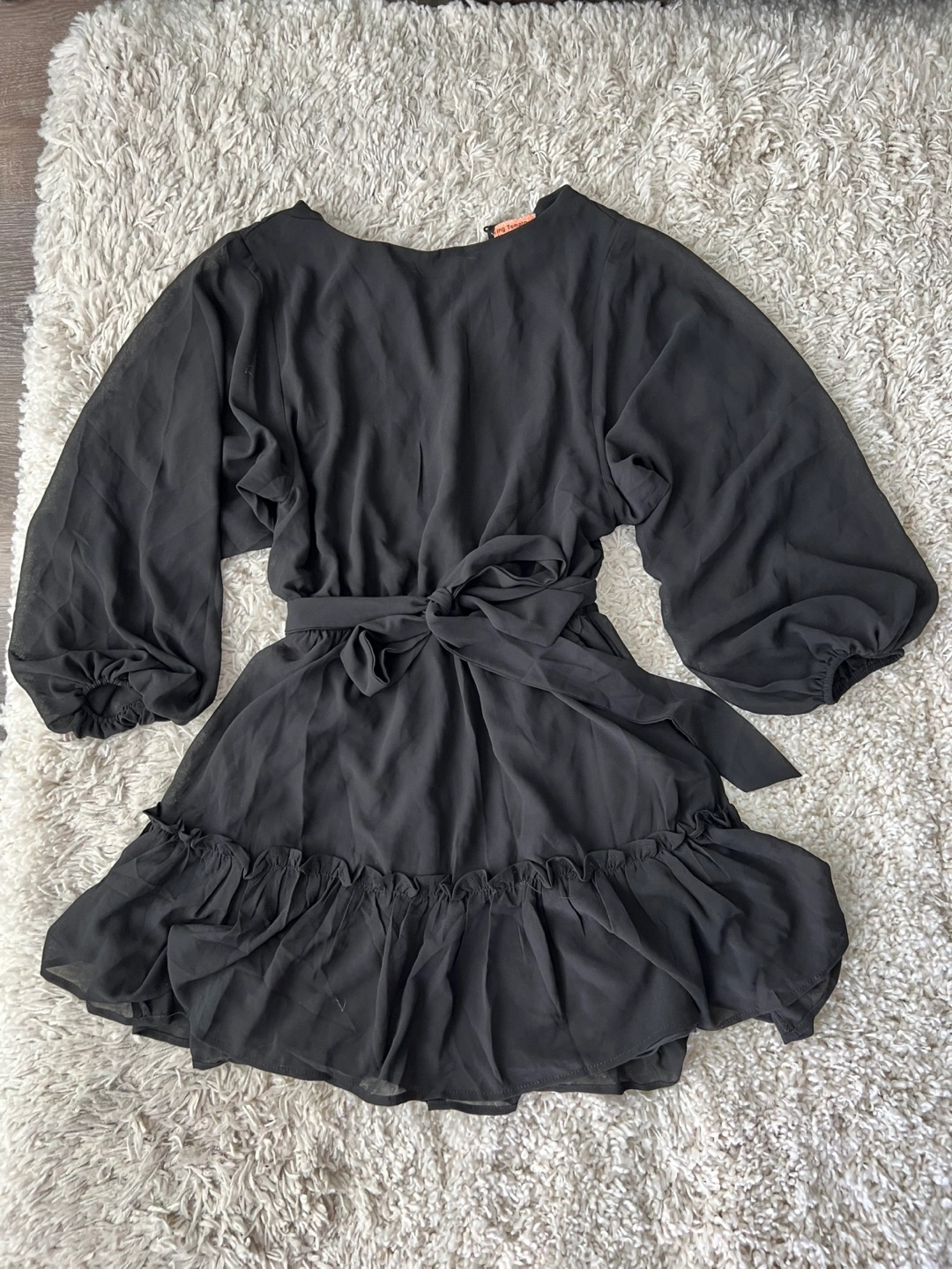 Selling a cute black mini dress! It features long, puffy sleeves and a tie belt at the waist. The bottom has a ruffled hem. Perfect for a night out or a special occasion!