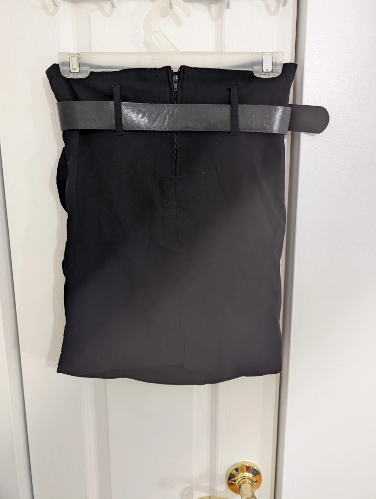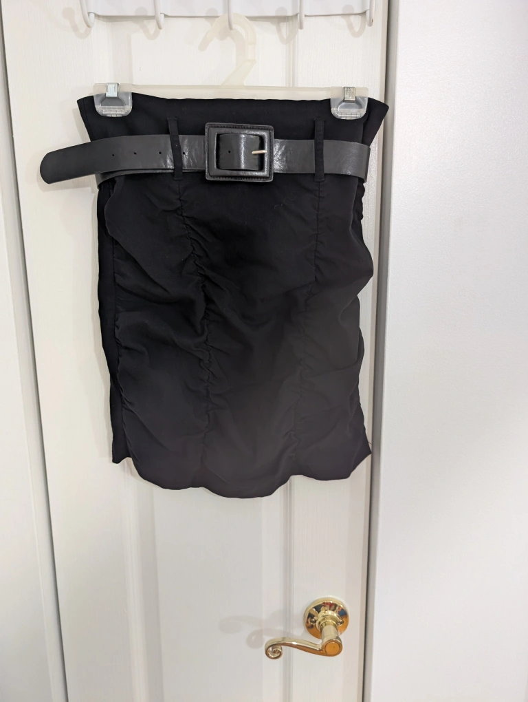 213Black mini skirt with a matching belt. The skirt has a gathered design and a zipper closure.