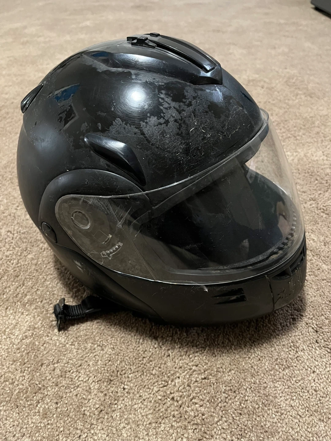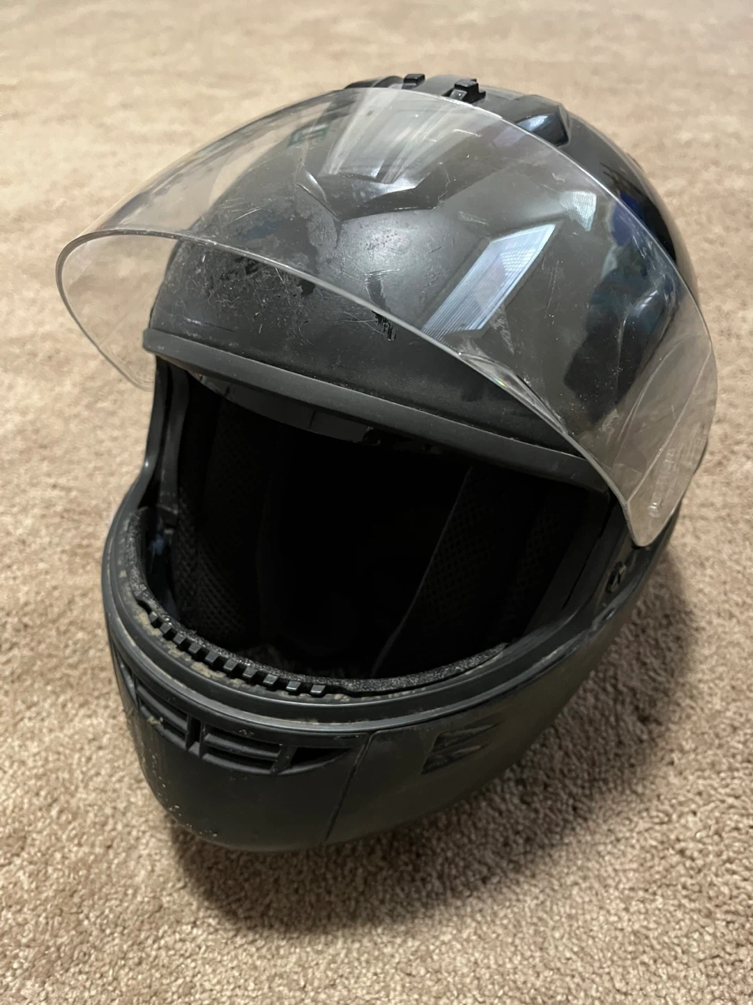 36Selling a black motorcycle helmet. It has a clear visor and some signs of wear, but it's still functional. Please see photos for condition