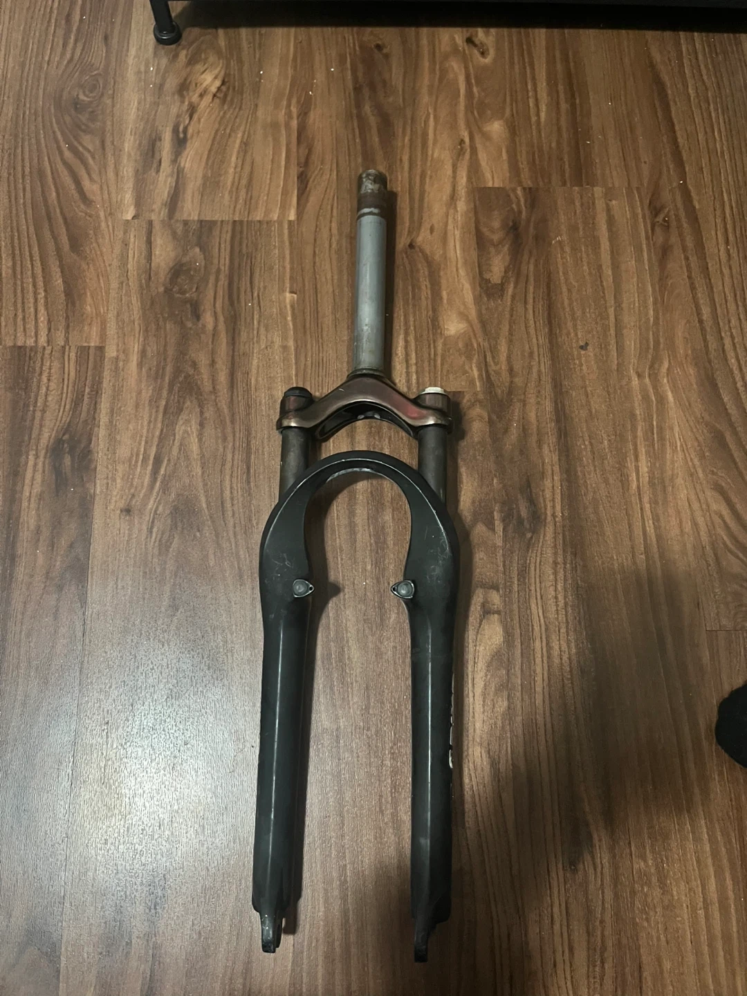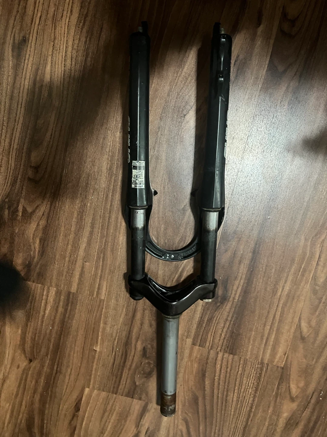 Selling a used black mountain bike suspension fork. It's in good condition and ready to be installed on your bike!