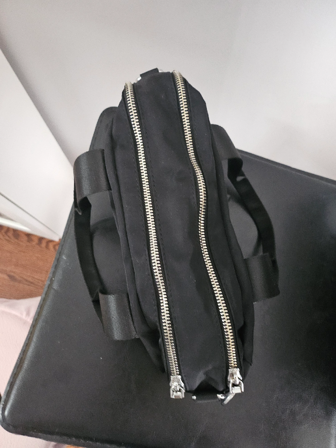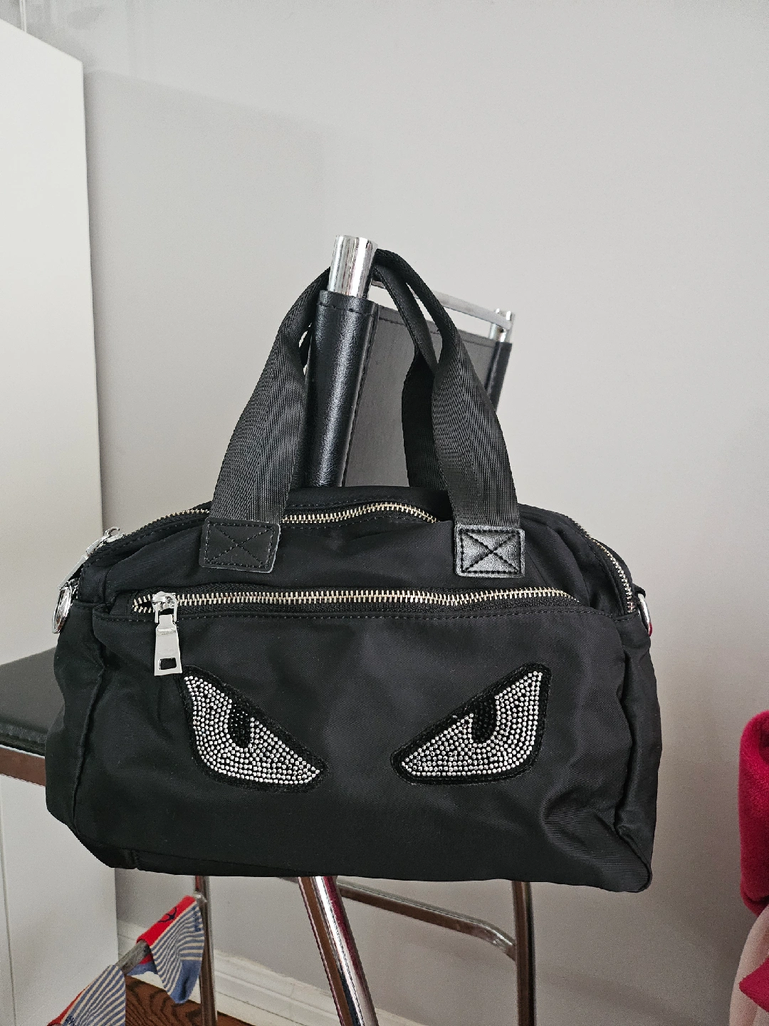1000+This is a stylish black nylon handbag. It features a unique eye design on the front. It's in great condition and ready for a new home