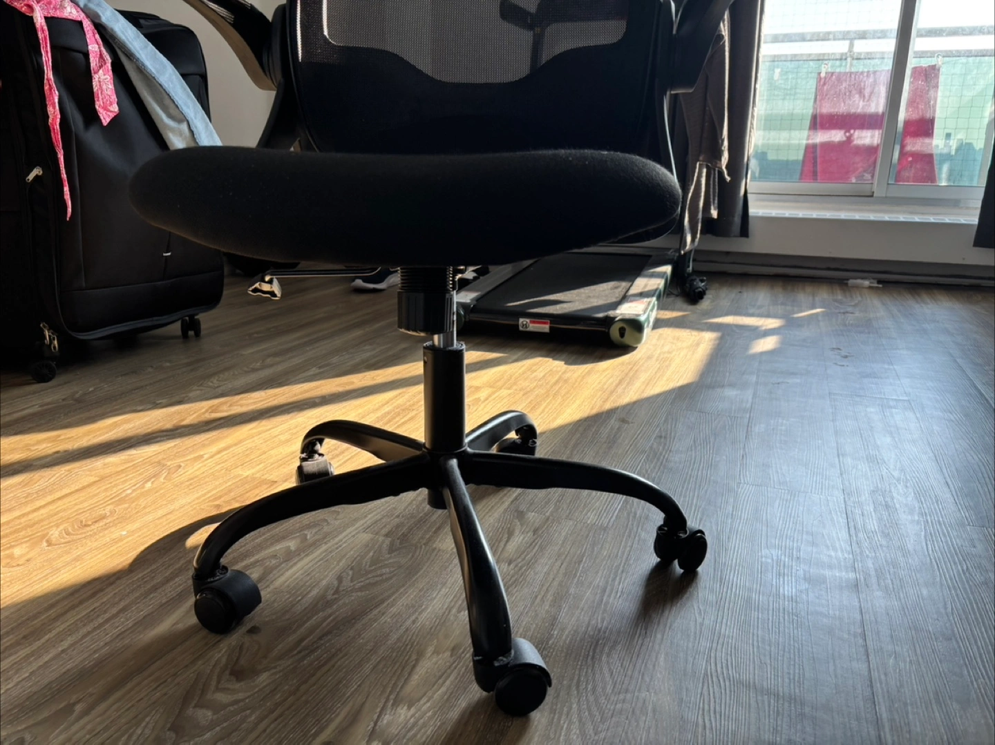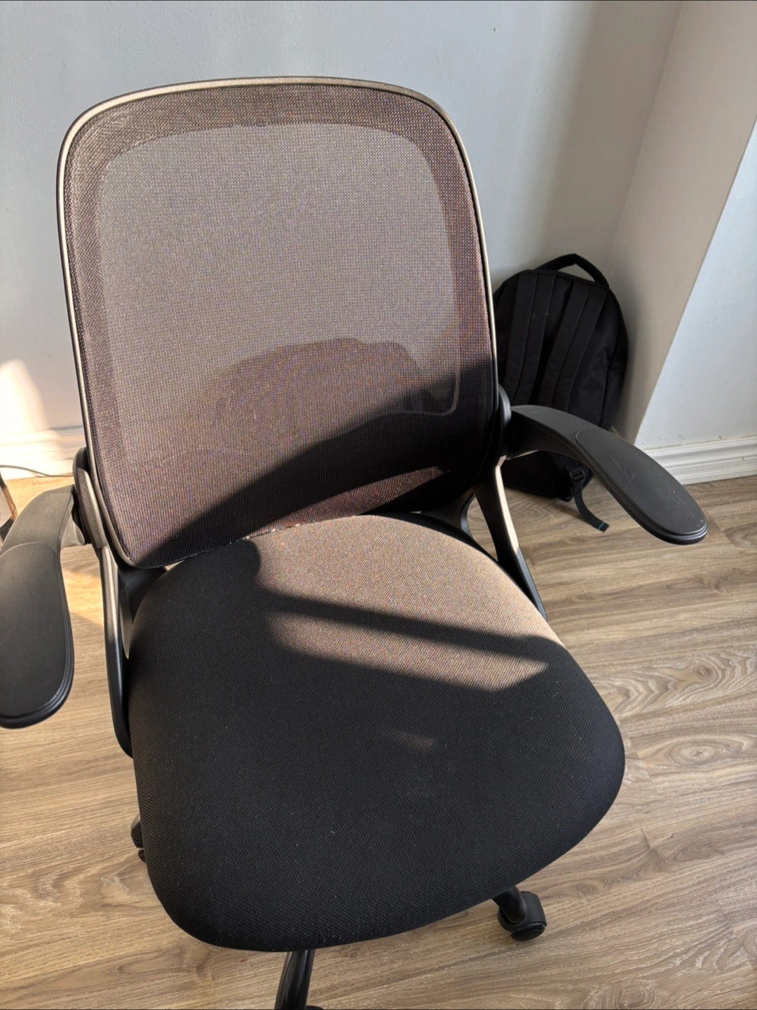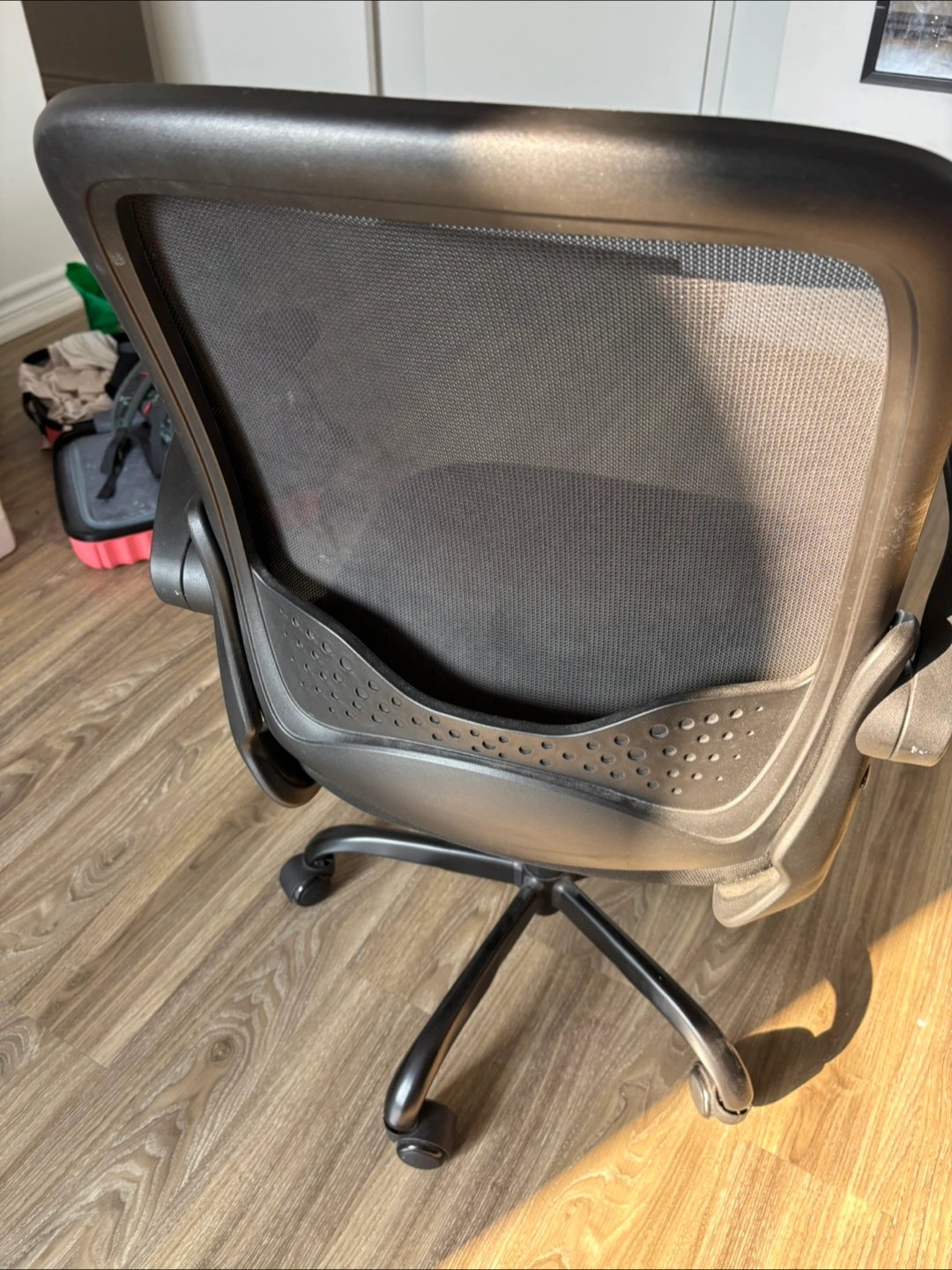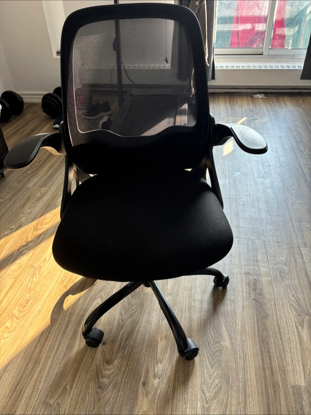Selling a comfortable black office chair. It features a breathable mesh back, perfect for long hours at your desk. The chair has adjustable arms and a sturdy base with wheels for easy movement. It's in great condition and ready for a new home!