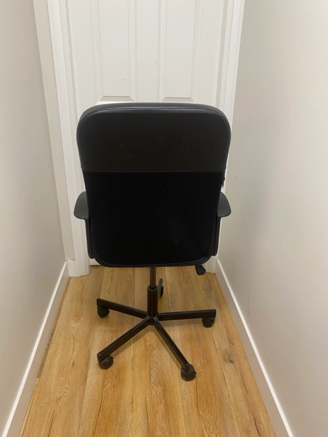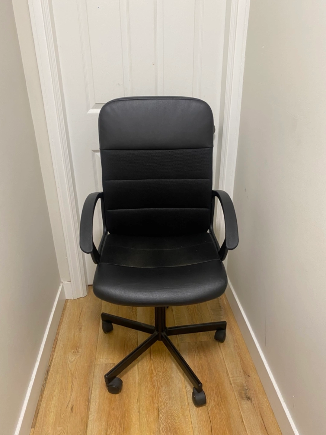 Selling a black office chair in good condition. It's perfect for a home office or study space. It has a comfortable seat and back, and it rolls smoothly. It's in great shape and ready for a new home!