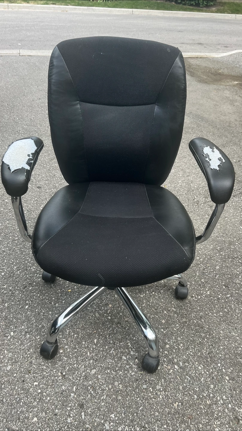 Selling a black office chair. It's still functional, but there is some wear and tear on the armrests as you can see in the pictures