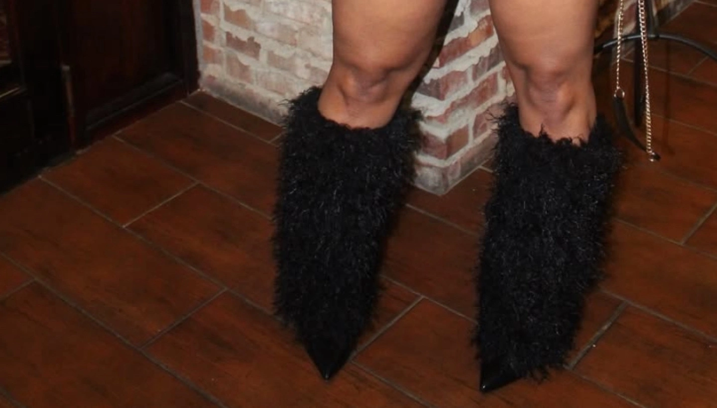 Black, furry boots. Pointed toe boots. Great for a cozy night out, feeling your best.