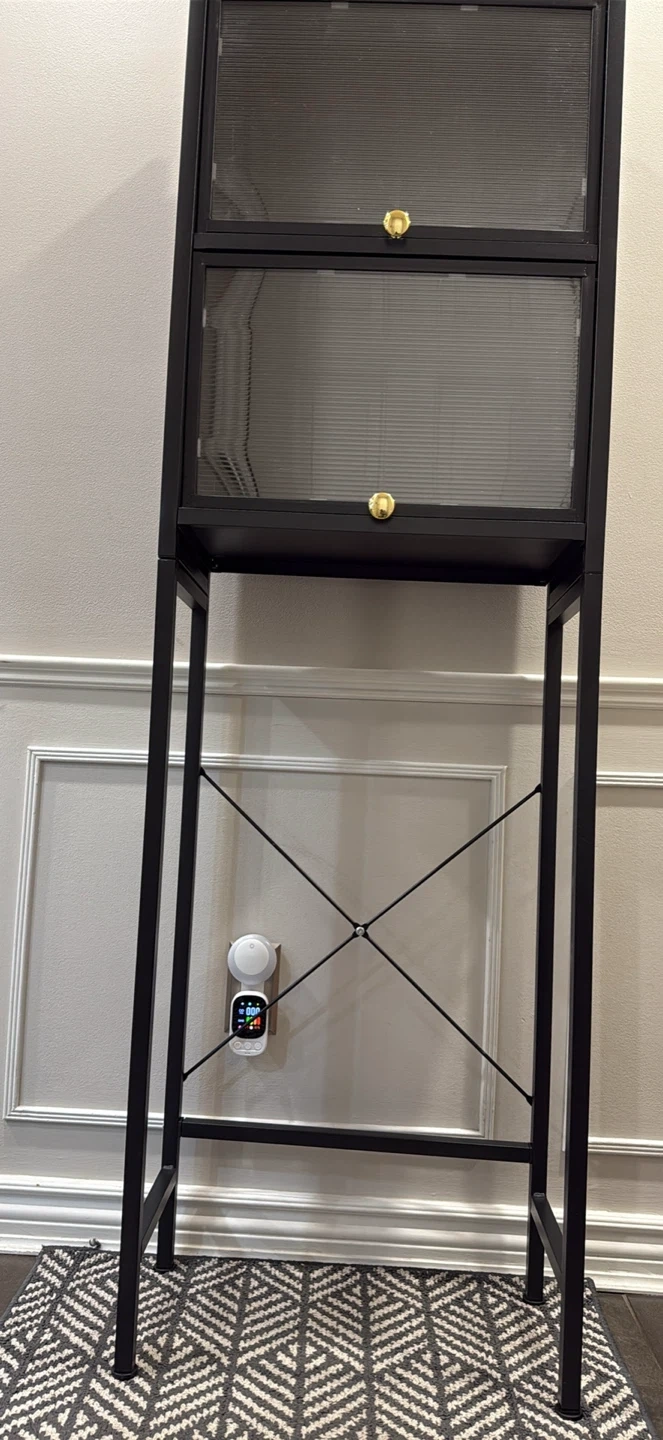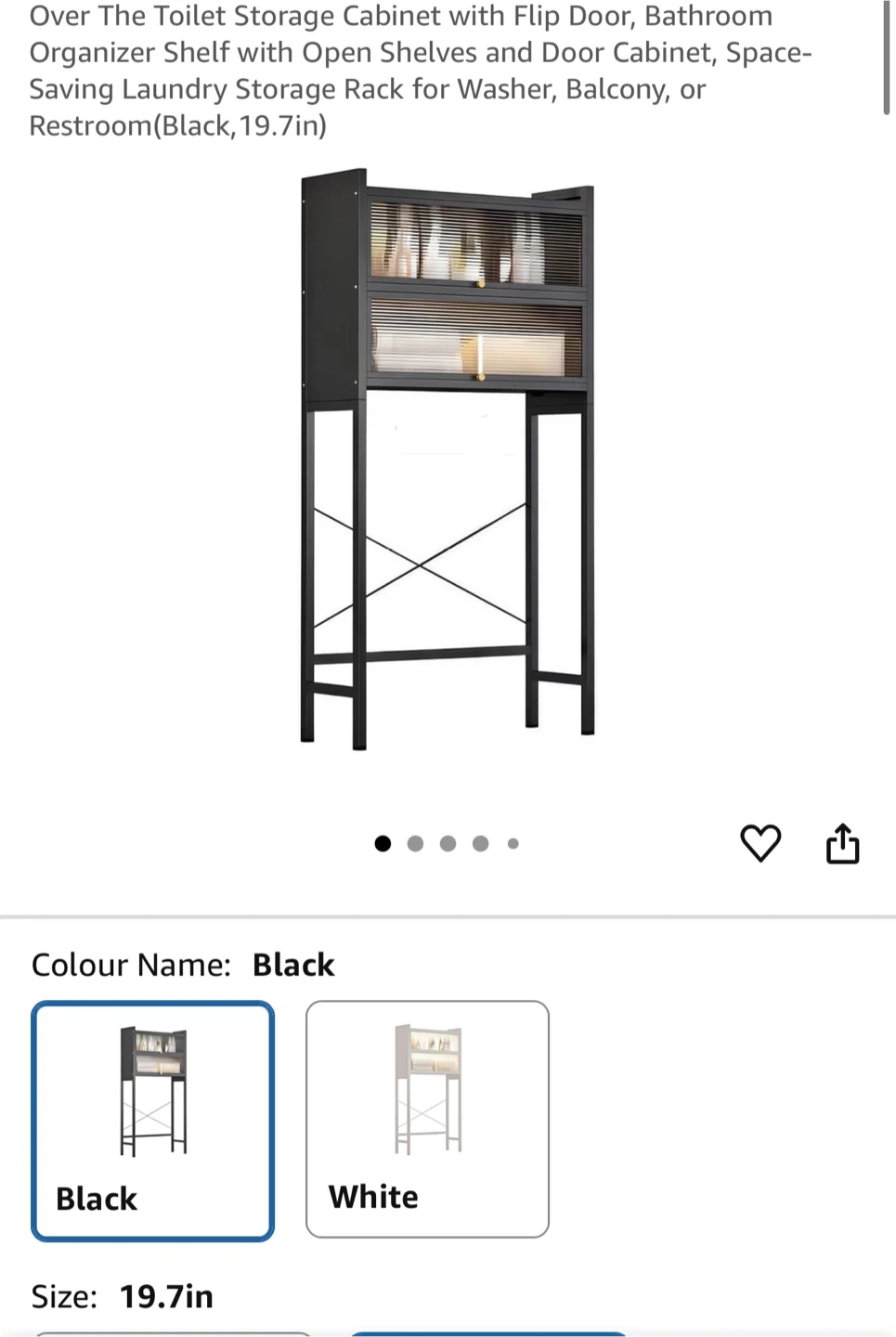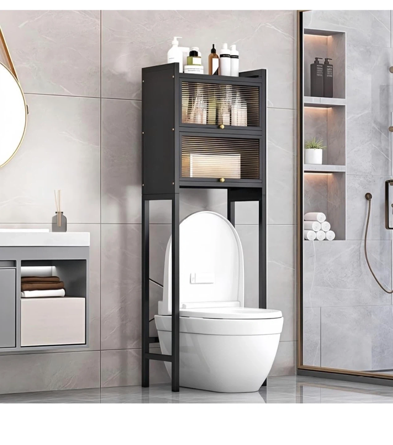 61Selling a black over-the-toilet storage cabinet. It features a flip door, bathroom organizer shelf with open shelves and a door cabinet. Great for saving space in your laundry room, balcony, or restroom! The size is 19.7 inches