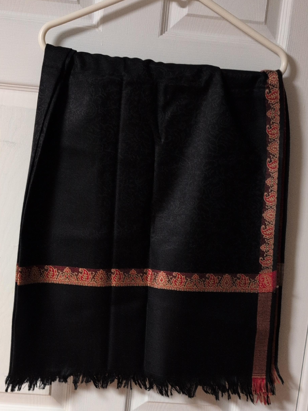 A beautiful black pashmina shawl with a decorative border! It's in great condition and ready to add a touch of elegance to your wardrobe