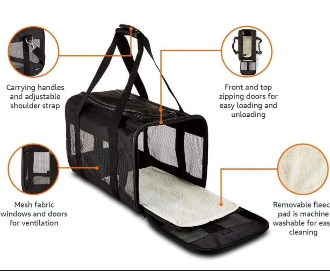 Selling a black pet carrier bag. It has carrying handles and an adjustable shoulder strap for easy transport. The front and top have zippers for easy loading and unloading. It also has mesh fabric windows and doors for ventilation. The removable fleece pad is machine washable for easy cleaning
