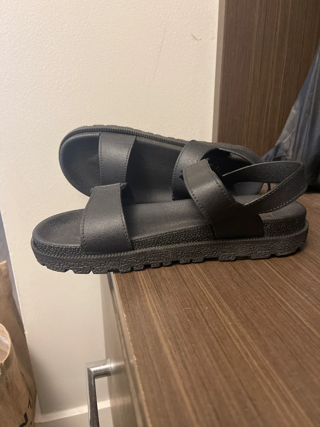 88Selling a pair of black platform sandals. They're in great shape and ready for a new home! The sandals feature a comfortable platform sole and adjustable straps. Only worn once, Fit men’s size 7, I believe they’re a women’s 8.