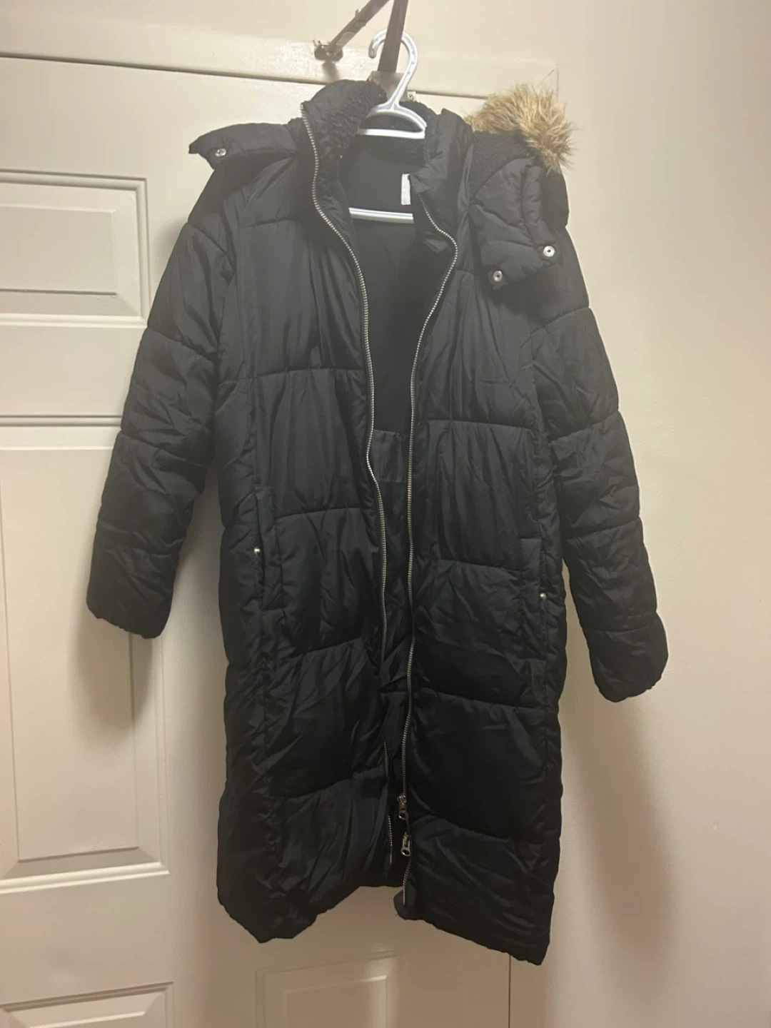 Selling a cozy black puffer coat! It features a faux fur trim on the hood, perfect for staying warm during those chilly Canadian winters. It's in great condition and ready for a new home