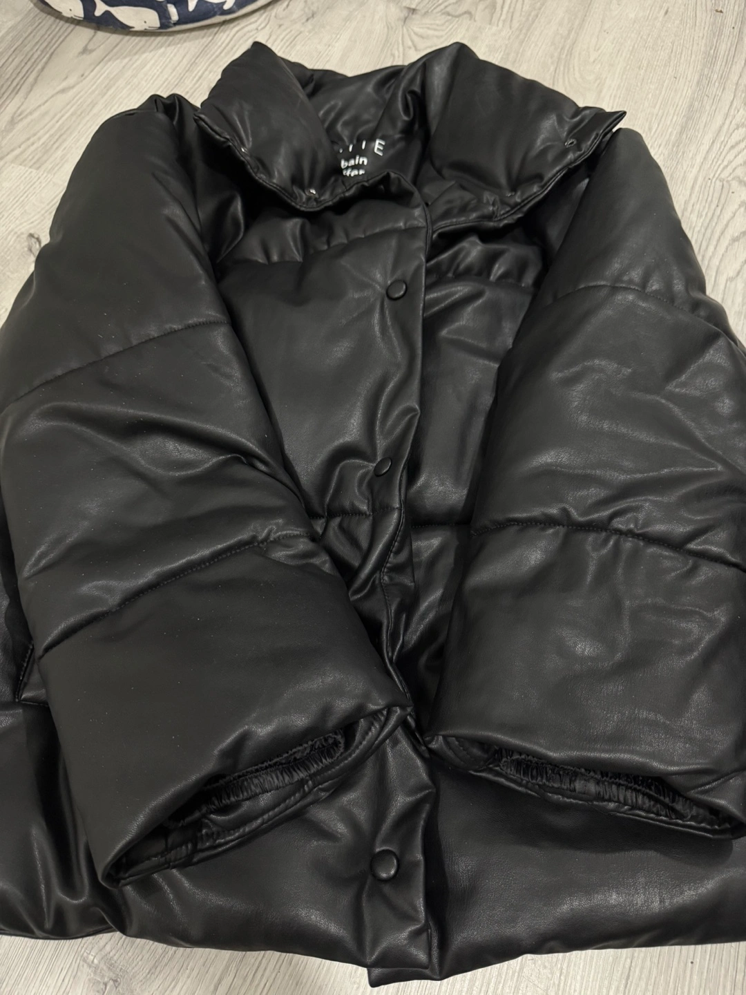 Black faux leather puffer jacket. Size L. Warm and trendy.