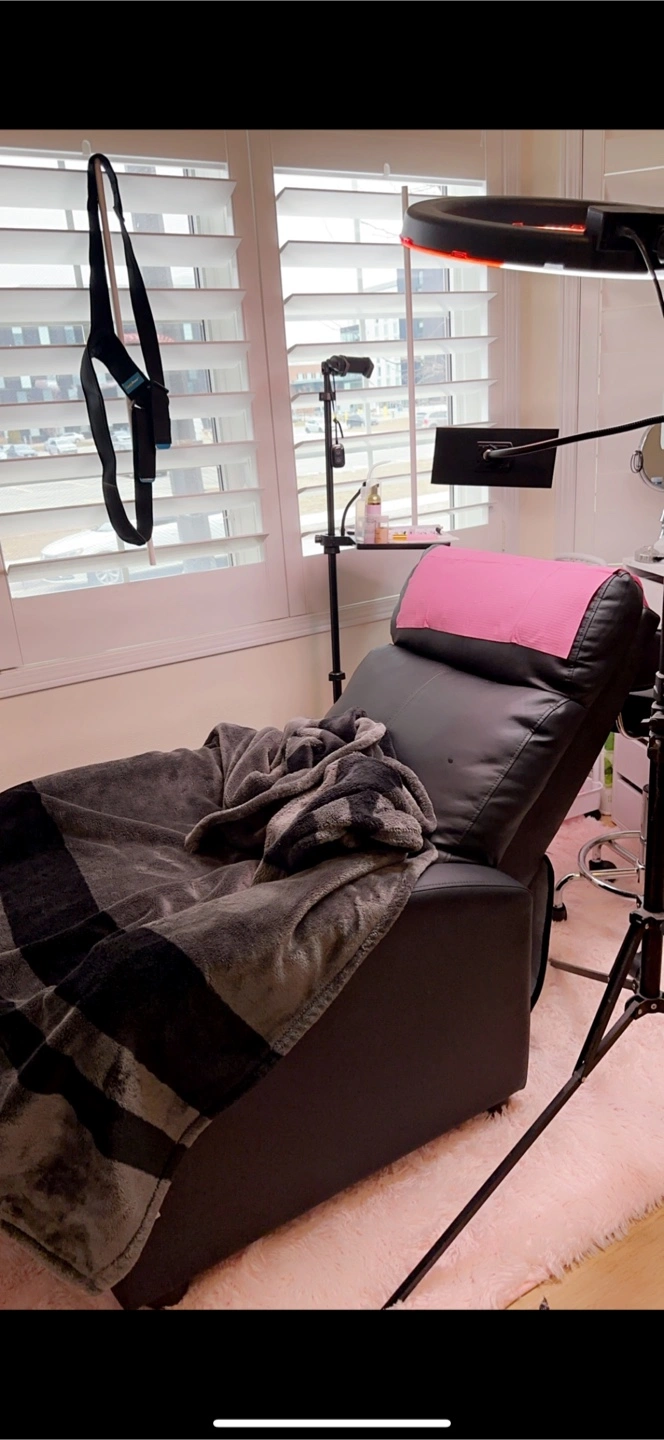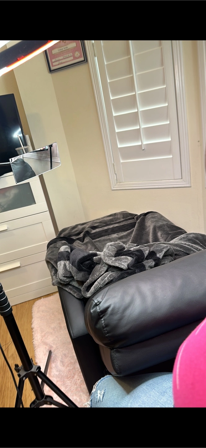 A black reclining chair. Covered with a dark blanket. A relaxing way to unwind after a long day.